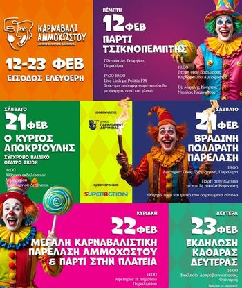 Ζήστε το Καρναβάλι Αμμοχώστου με πάρτι, παρελάσεις, παιδικές εκδηλώσεις και Καθαρά Δευτέρα από 12–23 Φεβρουαρίου 2026. Ελεύθερη είσοδος. Scroll down for English version 👇 Το Καρναβάλι Αμμοχώστου επιστρέφει από τις 12 έως τις 23 Φεβρουαρίου 2026 με ένα πλούσιο και πολυήμερο πρόγραμμα αποκριάτικων εκδηλώσεων. Ο Δήμος Παραλιμνίου – Δερύνειας προσκαλεί μικρούς και μεγάλους σε μια γιορτή γεμάτη μουσική, παρελάσεις, παραδοσιακά στοιχεία και σύγχρονη διασκέδαση, που απλώνεται σε διάφορες κοινότητες της επαρχίας. Η έναρξη γίνεται με το Πάρτι Τσικνοπέμπτης, ενώ το πρόγραμμα συνεχίζεται με παιδική παράσταση σύγχρονου θεάτρου σκιών, βραδινή ποδαράτη παρέλαση, τη μεγάλη καρναβαλίστικη παρέλαση με πάρτι στην πλατεία και κορυφώνεται με την εκδήλωση της Καθαράς Δευτέρας. Τις εκδηλώσεις πλαισιώνουν DJs και ζωντανές μουσικές εμφανίσεις, με συμμετοχές όπως ο DJ Μιχάλης Κούρτης, ο Νικόλας Καρυώτης και μουσικούς σε σαξόφωνο, βιολί και φωνή, δημιουργώντας έντονη γιορτινή ατμόσφαιρα. 🎟️ Δωρεάν είσοδος. 🗓️ Πρόγραμμα Πέμπτη, 12 Φεβρουαρίου 2026 | 17:00 – Πάρτι Τσικνοπέμπτης (Πλατεία Αγίου Γεωργίου, Παραλίμνι) Σάββατο, 21 Φεβρουαρίου 2026 | 16:00 – «Ο Κύριος Αποκριούλης», σύγχρονο παιδικό θέατρο σκιών (Αίθουσα Εκδηλώσεων Δήμου Παραλιμνίου – Δερύνειας) Σάββατο, 21 Φεβρουαρίου 2026 | 19:00 – Βραδινή Ποδαράτη Παρέλαση (Οδός Γρίβα Διγενή, Παραλίμνι) Κυριακή, 22 Φεβρουαρίου 2026 | 14:00 – Μεγάλη Καρναβαλίστικη Παρέλαση & Πάρτι στην Πλατεία (Β’ Δημοτικό Σχολείο Παραλιμνίου) Δευτέρα, 23 Φεβρουαρίου 2026 | 14:00 – Εκδήλωση Καθαράς Δευτέρας (Εκκλησία Ασπροβουνιώτισσας, Φρενάρους) Για πληροφορίες και δηλώσεις συμμετοχής, απευθυνθείτε στους διοργανωτές (Δήμος Παραλιμνίου – Δερύνειας). EN The Ammochostos Carnival in Ammochostos, Cyprus runs from 12 to 23 February 2026, offering a diverse programme of carnival events across the district. Organised by the Municipality of Paralimni–Deryneia, the festival combines traditional carnival spirit with family-friendly activities and large-scale parades. The programme opens with a Tsiknopempti carnival party, followed by a modern children’s shadow theatre performance, an evening walking parade, the grand carnival parade with a party in the square, and concludes with a Clean Monday celebration. DJs and live musicians, including DJ Michalis Kourtis, Nikolas Karyotis and live performances on saxophone, violin and vocals, accompany the festivities throughout the carnival period. 🎟️ Free entry. 🗓️ Schedule Thursday, February 12, 2026 | 17:00–19:00 – Tsiknopempti Carnival Party (Agiou Georgiou Square, Paralimni) Saturday, February 21, 2026 | 16:00 – “Mr Apokrioulis”, modern children’s shadow theatre (Event Hall, Municipality of Paralimni–Deryneia) Saturday, February 21, 2026 | 19:00 – Evening Walking Carnival Parade (Griva Digeni Street, Paralimni) Sunday, February 22, 2026 | 14:00 – Grand Carnival Parade & Party in the Square (B’ Elementary School, Paralimni) Monday, February 23, 2026 | 14:00 – Clean Monday Celebration (Church of Asprovouniotissa, Frenaros) For enquiries and booking details, contact the event organiser directly (Municipality of Paralimni–Deryneia). Explore more Carnival Events → eventor.com.cy/events/category/carnival-127 ❓ FAQ Q: Is entry free for all carnival events? A: Yes, all Ammochostos Carnival events are free to attend. Q: Are there activities for children? A: Yes, the programme includes a dedicated children’s shadow theatre performance. Q: Does the carnival take place in one location? A: No, events are hosted at multiple venues across Paralimni and Frenaros. Q: Who organises the Ammochostos Carnival? A: The carnival is organised by the Municipality of Paralimni–Deryneia.