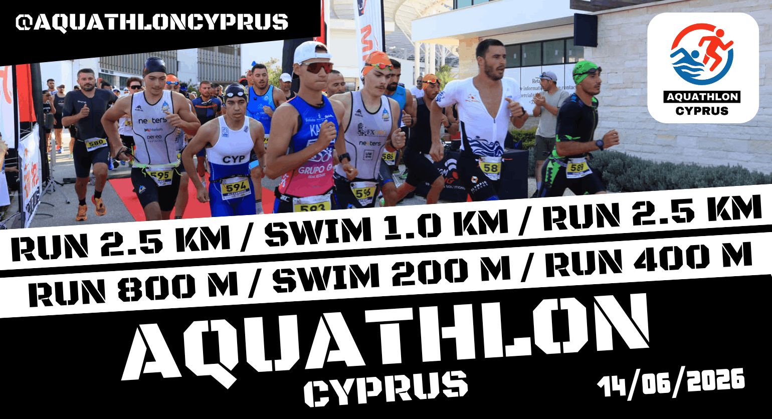 Aquathlon Cyprus 2026 takes place at Ayia Napa Marina on 14 June 2026 — run-swim-run for Federation, Open Category, and Youth athletes. Registration open. Tickets available. --- Scroll down for English version 👇 --- Το Aquathlon Cyprus 2026 διεξάγεται την Κυριακή 14 Ιουνίου 2026 στη Μαρίνα Αγίας Νάπας, προσκαλώντας αθλητές Ομοσπονδίας, Open Category και Νέους στην πιο δυναμική πρόκληση run-swim-run της χρονιάς. Φιλοξενία από τη Μαρίνα Αγίας Νάπας. Διαθέσιμες αποστάσεις: Federation & Open Category: 2,5 χλμ τρέξιμο → 1,0 χλμ κολύμβηση → 2,5 χλμ τρέξιμο. Youth Race: 800 μ τρέξιμο → 200 μ κολύμβηση → 400 μ τρέξιμο. Η εκδήλωση απευθύνεται σε κολυμβητές, δρομείς, swimrunners, τριαθλητές και όποιον επιθυμεί να δοκιμάσει τα όριά του σε ένα μοναδικό παράκτιο σκηνικό. 🗓️ Πρόγραμμα Κυριακή, 14 Ιουνίου 2026 (Μαρίνα Αγίας Νάπας) Για περισσότερες πληροφορίες, επικοινωνήστε απευθείας με τους διοργανωτές του Aquathlon Cyprus. ❓ Συχνές Ερωτήσεις Ε: Απαιτείται προηγούμενη εμπειρία στο triathlon ή στο aquathlon; Α: Όχι. Η εκδήλωση απευθύνεται σε αθλητές όλων των επιπέδων — από κολυμβητές και δρομείς μέχρι τριαθλητές και swimrunners. Ε: Υπάρχει ηλικιακό όριο για τη συμμετοχή στο Youth Race; Α: Δεν αναφέρεται συγκεκριμένο ηλικιακό εύρος στην πηγή. Επικοινωνήστε με τους διοργανωτές για λεπτομέρειες. Ε: Πού βρίσκεται η ακριβής τοποθεσία εκκίνησης; Α: Ο αγώνας διεξάγεται στη Μαρίνα Αγίας Νάπας. Για περισσότερες λεπτομέρειες σχετικά με το σημείο συνάντησης, παρακολουθήστε τα κανάλια @aquathloncyprus. --- EN Aquathlon Cyprus 2026 takes place on Sunday 14 June 2026 at Ayia Napa Marina, Cyprus, welcoming Federation athletes, Open Category competitors, and Youth participants to a run-swim-run challenge by the sea. Hospitality partner: Ayia Napa Marina. Two race distances are available: Federation & Open Category: 2.5km run → 1.0km swim → 2.5km run. Youth Race: 800m run → 200m swim → 400m run. The event is open to swimmers, runners, swimrunners, triathletes, and anyone ready to push their limits in a seaside setting. Whether you are stepping into a multi-discipline race for the first time or chasing a personal best, Aquathlon Cyprus offers a welcoming and competitive environment for all. 🗓️ Schedule Sunday, 14 June 2026 (Ayia Napa Marina) For more information and registration details, please contact Aquathlon Cyprus directly. ❓ FAQ Q: Do I need prior triathlon or aquathlon experience to enter? A: No. The event welcomes athletes of all levels, from swimmers and runners to triathletes and swimrunners. Q: What age group is the Youth Race for? A: A specific age range is not stated in the source. Contact the organisers directly for details. Q: Where exactly is the race start location? A: The race takes place at Ayia Napa Marina. For precise start line and meeting point details, follow @aquathloncyprus on social media for updates. Explore more Sports & Fitness → eventor.com.cy/events/category/sports---fitness-111