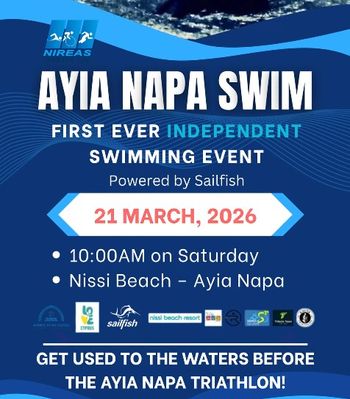 Ayia Napa Swim takes place at Nissi Beach on March 21, 2026, offering open water swim distances during the Ayia Napa Triathlon weekend. Scroll down for English version 👇 Το Ayia Napa Swim προσφέρει την ευκαιρία για μια μοναδική εμπειρία κολύμβησης ανοιχτής θάλασσας σε έναν από τους πιο εμβληματικούς παραθαλάσσιους προορισμούς της Ευρώπης. Η διοργάνωση πραγματοποιείται στην Nissi Beach, στην Ayia Napa, στο πλαίσιο του σαββατοκύριακου του Ayia Napa Triathlon, προσκαλώντας αθλητές και λάτρεις της κολύμβησης να δοκιμάσουν τις δυνάμεις τους σε καθαρά, κρυστάλλινα νερά. Η εκδήλωση απευθύνεται τόσο σε αθλητές του Ayia Napa Triathlon που επιθυμούν να εξοικειωθούν με τη διαδρομή της κολύμβησης, όσο και σε συνοδούς, φίλους και ανεξάρτητους κολυμβητές ανοιχτής θάλασσας. Οι συμμετέχοντες μπορούν να επιλέξουν ανάμεσα σε απόσταση 2,5 χιλιομέτρων ή 5 χιλιομέτρων, με απαραίτητη τη βασική εμπειρία σε ανοιχτή θάλασσα και την ικανότητα ολοκλήρωσης της επιλεγμένης διαδρομής. Η διοργάνωση περιλαμβάνει ναυαγοσωστική κάλυψη και υποστήριξη ασφάλειας στο νερό, ιατρική υποστήριξη στον χώρο, ηλεκτρονική χρονομέτρηση και επίσημο σκουφάκι κολύμβησης. Οι κατηγορίες διαμορφώνονται ανά φύλο και ηλικιακή ομάδα, με βάση το έτος γέννησης των αθλητών. 🗓️ Πρόγραμμα Σάββατο, 21 Μαρτίου 2026 | 10:00 (Nissi Beach, Αγία Νάπα) 08:30–09:30 Παραλαβή εξοπλισμού @ Taverna Nissi Beach Resort 09:45 Ενημέρωση αθλητών @ Nissi Beach 10:00 Εκκίνηση αγώνα @ Nissi Beach 13:00 Απονομές @ Taverna Nissi Beach Resort Για περισσότερες πληροφορίες και εγγραφές, επικοινωνήστε απευθείας με τους διοργανωτές. EN This open water swimming event in Ayia Napa, Cyprus takes place at Nissi Beach on Saturday, March 21, 2026, as part of the Ayia Napa Triathlon weekend. Ayia Napa Swim offers participants the chance to experience crystal-clear waters and a scenic coastline in one of the island’s most iconic locations. The event is designed for triathlon athletes preparing for race day, accompanying friends and family, and open water swimming enthusiasts seeking a 2.5km or 5km distance challenge. Safety and support include professional lifeguard coverage, medical assistance on site, electronic timing and an official swim cap. Athlete categories are determined by year of birth. 🗓️ Schedule Saturday, March 21, 2026 | 10:00 (Nissi Beach, Ayia Napa) 08:30–09:30 Bag pickup @ Taverna Nissi Beach Resort 09:45 Race briefing @ Nissi Beach 10:00 Race start @ Nissi Beach 13:00 Awards @ Taverna Nissi Beach Resort For more information and registration details, please contact the organiser directly. Explore more Sports & Fitness → eventor.com.cy/events/category/sports---fitness-111 ❓ FAQ Q: Who can take part in Ayia Napa Swim? A: Triathlon athletes, accompanying family and friends, and open water swimming enthusiasts. Q: What distances are available? A: Participants can choose between a 2.5km or 5km swim. Q: Are there cut-off times? A: Yes, 1.5 hours for the 2.5km swim and 2.5 hours for the 5km swim. Q: How are age categories determined? A: Categories are based on the athlete’s year of birth, not the exact date.