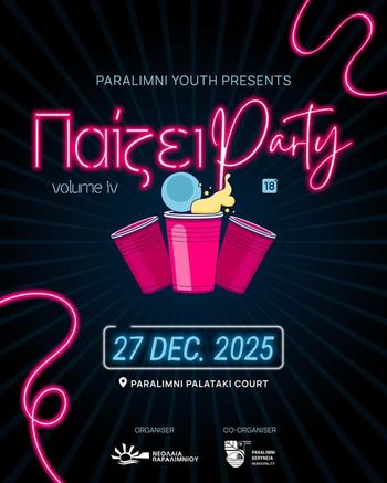 Νεανικό party με παιχνίδια, εκπλήξεις και νέο concept στο Παραλίμνι — 27 Δεκεμβρίου 2025 στο Palataki Court. Ενέργεια και ανανεωμένες ιδέες. Scroll down for English version ⯆ Το Παίζει Party επιστρέφει στο Παραλίμνι με το Volume IV στις 27 Δεκεμβρίου 2025, στο Palataki Court. Η εκδήλωση που έχει γίνει θεσμός για τη νεολαία της περιοχής φέρνει ξανά παιχνίδια, δοκιμασίες και πολλές ανατροπές σε μια βραδιά γεμάτη ενέργεια. Η ομάδα της Νεολαίας Παραλιμνίου και οι συνδιοργανωτές ετοιμάζουν νέες προσθήκες, φρέσκες ιδέες και παιχνιδιάρικες εκπλήξεις που ανανεώνουν πλήρως τη φετινή εμπειρία. Η εκδήλωση απευθύνεται σε άτομα 18+. Το event είναι γνωστό για τη ζωντανή του ατμόσφαιρα, την αίσθηση κοινότητας και το fun character που ενώνει τη νεολαία της περιοχής σε ένα non-stop παιχνίδι και party mood. 🗓️ Πρόγραμμα Σάββατο, 27 Δεκεμβρίου 2025 | Ώρα ανακοίνωσης (Palataki Court, Παραλίμνι) EN Paizei Party returns to Paralimni with Volume IV on December 27, 2025 at Palataki Court. A youth event known for its high energy, games, challenges and playful twists brings a refreshed edition with new surprises and additions for an even more exciting experience. Organised by Paralimni Youth, the event is designed for participants 18+ and promises a vibrant atmosphere, community spirit and plenty of fun moments throughout the night. 🗓️ Schedule Saturday, December 27, 2025 | Time to be announced (Palataki Court, Paralimni) Explore more Nightlife & Parties → eventor.com.cy/events/category/nightlife---parties-128 ❓ FAQ Q: Is there an age restriction? A: Yes, the event is for ages 18+. Q: Do I need a ticket to attend? A: No ticket details were provided by the organizers. Q: Where does the event take place? A: At Palataki Court in Paralimni. Q: What type of activities should I expect? A: Party games, fun challenges and new surprises added for this year’s edition.