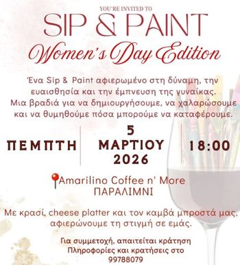 Celebrate Women’s Day in Paralimni this March 2026 with a Sip & Paint evening at Amarilino Coffee n’ More, featuring wine, creativity and good vibes. Reservation required. Scroll down for English version 👇 Ένα ξεχωριστό Sip & Paint αφιερωμένο στη δύναμη, την ευαισθησία και την έμπνευση της γυναίκας θα πραγματοποιηθεί την Πέμπτη 5 Μαρτίου 2026, στις 18:00, στο Amarilino Coffee n’ More στο Παραλίμνι. Μια βραδιά δημιουργίας και χαλάρωσης, όπου η τέχνη συναντά το κρασί σε μια γιορτινή ατμόσφαιρα. Με τον καμβά μπροστά σας, κρασί και cheese platter, η εκδήλωση προσκαλεί τις συμμετέχουσες να εκφραστούν ελεύθερα, να γελάσουν και να αφιερώσουν τη στιγμή στον εαυτό τους. Δεν απαιτείται προηγούμενη εμπειρία στη ζωγραφική — μόνο διάθεση για δημιουργία. 🗓️ Πρόγραμμα Πέμπτη, 5 Μαρτίου 2026 | 18:00 (Amarilino Coffee n’ More, Παραλίμνι) Τηλέφωνο για κρατήσεις: 99788079 EN This Women’s Day Sip & Paint event in Paralimni, Cyprus takes place on Thursday, March 5, 2026 at 18:00 at Amarilino Coffee n’ More. Dedicated to celebrating the strength and inspiration of women, the evening combines painting, wine and a cheese platter in a relaxed and creative setting. No prior painting experience is required — just the desire to unwind and enjoy a meaningful after-work gathering. 🗓️ Schedule Thursday, March 5, 2026 | 18:00 (Amarilino Coffee n’ More, Paralimni) Phone (for reservations): 99788079 Explore more Art & Markets → eventor.com.cy/events/category/art---markets-118 ❓ FAQ Q: Do I need painting experience to join? A: No, no prior experience is required. Q: What is included in the event? A: Participants enjoy painting on canvas, wine and a cheese platter. Q: Where is the event held? A: At Amarilino Coffee n’ More in Paralimni. Q: How can I reserve a place? A: By calling 99788079 for reservations.