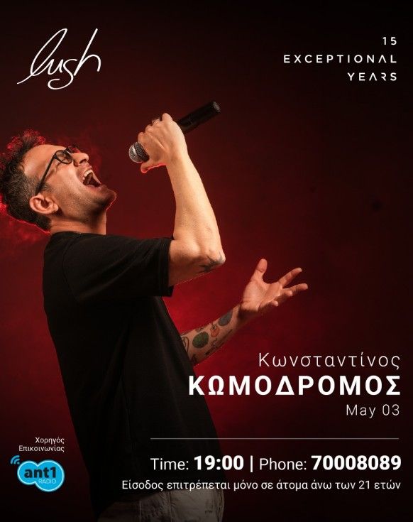 Κωνσταντίνος Κωμοδρόμος live στο Lush Beach Bar στη Λάρνακα, Μάιος 2026. 15 χρόνια Lush, μια βραδιά να θυμάσαι. --- Scroll down for English version 👇 --- Ο Κωνσταντίνος Κωμοδρόμος ανεβαίνει στη σκηνή του Lush Beach Bar στην παραλία Μακένζυ στη Λάρνακα, στο πλαίσιο του εορτασμού 15 χρόνων του Lush. Μια ξεχωριστή βραδιά γεμάτη ζωντανή μουσική, δίπλα στη θάλασσα. Η είσοδος επιτρέπεται αποκλειστικά σε άτομα 21+. 🗓️ Πρόγραμμα Σάββατο, 3 Μαΐου 2026 | 19:00 (Lush Beach Bar, Μακένζυ, Λάρνακα) Τηλέφωνο: 70008089 ❓ Συχνές Ερωτήσεις Ε: Υπάρχει ηλικιακός περιορισμός; Α: Ναι, η είσοδος επιτρέπεται αποκλειστικά σε άτομα 21 ετών και άνω. Ε: Χρειάζεται κράτηση; Α: Για κρατήσεις καλέστε στο 70008089. --- EN Konstantinos Komodromos takes the stage at Lush Beach Bar on Mackenzie Beach in Larnaca, Cyprus, as part of Lush's 15th anniversary celebrations. A night to remember with live music right by the sea. Entry is strictly for ages 21 and above. 🗓️ Schedule Saturday, May 3, 2026 | 19:00 (Lush Beach Bar, Mackenzie Beach, Larnaca) Phone: 70008089 ❓ FAQ Q: Is there an age restriction? A: Yes, entry is strictly for ages 21 and above. Q: Do I need a reservation? A: For reservations call 70008089. Explore more Concerts & Live Music → eventor.com.cy/events/category/concerts---live-music-114