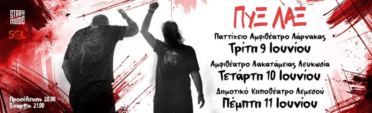 Πυξ Λαξ — τρεις συναυλίες σε Λάρνακα, Λευκωσία και Λεμεσό, Ιούνιος 2026. Ροκ παλμός και διαχρονικές επιτυχίες. Εισιτήρια διαθέσιμα. --- Scroll down for English version 👇 --- Οι Πυξ Λαξ έρχονται στην Κύπρο για τρεις καλοκαιρινές συναυλίες σε Λάρνακα, Λευκωσία και Λεμεσό, σε διοργάνωση της Sol Music Productions. Ένα ραντεβού που κρατάει χρόνια, με ένταση, ιστορία και τραγούδια που αντέχουν στον χρόνο. 🎟️ Εισιτήρια από €25 (προπώληση: €25 & €30). Η μεγάλη τους καλοκαιρινή περιοδεία φέρει τη γνώριμη υπογραφή τους: ροκ παλμό, ηλεκτρισμό και αλήθεια. Στις αποσκευές τους, οι διαχρονικές επιτυχίες «Μοναξιά μου όλα», «Γιατί», «Ανόητες Αγάπες» και πολλά ακόμη αγαπημένα κομμάτια, μαζί με το νέο τους άλμπουμ «Λίγο Χρώμα Για Τα Σκούρα» που ανοίγει το επόμενο κεφάλαιο της πορείας τους, με τη «Μεθυσμένη Καρδιά» και το «Καράβια που περάσατε» να δίνουν τον τόνο. Οι πόρτες ανοίγουν στις 20:00. 🗓️ Πρόγραμμα Τρίτη, 9 Ιουνίου 2026 | 21:00 (Παττίχειο Δημοτικό Αμφιθέατρο Λάρνακας) Τετάρτη, 10 Ιουνίου 2026 | 21:00 (Αμφιθέατρο Λακατάμιας, Λευκωσία) Πέμπτη, 11 Ιουνίου 2026 | 21:00 (Δημοτικό Κηποθέατρο Λεμεσού) Για περισσότερες πληροφορίες, επικοινωνήστε απευθείας με Sol Music Productions. ❓ Συχνές Ερωτήσεις Ε: Τι ώρα ανοίγουν οι πόρτες; Α: Οι πόρτες ανοίγουν στις 20:00, με έναρξη συναυλίας στις 21:00. Ε: Οι συναυλίες είναι σε εσωτερικό ή εξωτερικό χώρο; Α: Και οι τρεις χώροι είναι υπαίθρια αμφιθέατρα. Ε: Υπάρχουν διαφορετικές τιμές εισιτηρίων; Α: Η προπώληση ξεκινά από €25 και €30, ανάλογα με τη ζώνη. --- EN Pyx Lax, one of Greece's most iconic rock bands, are coming to Cyprus for three summer concerts across Larnaca, Limassol, and Nicosia, Cyprus, organised by Sol Music Productions. A long-awaited return bringing rock energy, electrifying performances, and songs that have stood the test of time. 🎟️ Ticket prices start from €25 (pre-sale: €25 & €30). The tour features their trademark sound: rock pulse, intensity, and authenticity. Fans can expect timeless hits alongside material from their latest album, "Ligo Chroma Gia Ta Skoura," which opens the next chapter of their journey. Doors open at 20:00 at all venues. 🗓️ Schedule Tuesday, June 9, 2026 | 21:00 (Pattichion Municipal Amphitheatre, Larnaca) Wednesday, June 10, 2026 | 21:00 (Lakatamia Amphitheatre, Nicosia) Thursday, June 11, 2026 | 21:00 (Limassol Municipal Garden Theatre, Limassol) For more information and registration details, please contact Sol Music Productions directly. ❓ FAQ Q: What time do doors open? A: Doors open at 20:00, with the concert starting at 21:00. Q: Are the concerts indoor or outdoor? A: All three venues are open-air amphitheatres. Q: Are there different ticket prices? A: Pre-sale tickets start from €25 and €30, depending on the zone. Explore more Concerts & Live Music → eventor.com.cy/events/category/concerts---live-music-114