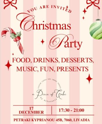 A Piece of Cake by Athanasia in Larnaka — 17 December 2025, 17:30 until late. Free entry with food, desserts, gifts and a big surprise. Scroll down for English version ↓ Το A Piece of Cake “by Athanasia” διοργανώνει μια μεγάλη γιορτή την Τετάρτη 17 Δεκεμβρίου 2025, από τις 17:30 έως αργά, στο κατάστημα στην οδό Πετρακί Κυπριανού 45Β στη Λιβάδια Λάρνακας. Μια ημέρα γεμάτη γεύσεις, χαμόγελα και γιορτινή διάθεση σας περιμένει να τη ζήσετε από κοντά. Οι επισκέπτες θα απολαύσουν νόστιμο φαγητό, λαχταριστά γλυκά, μουσική και δώρα για όλους, ενώ στο τέλος της βραδιάς θα αποκαλυφθεί ένα μεγάλο εκπληκτικό δώρο μετά την ειδική κλήρωση! Ένα event ιδανικό για οικογένειες, φίλους και όλους όσοι αγαπούν τις γλυκές εμπειρίες. 🍰🎁 Η συμμετοχή είναι ανοιχτή σε όλους χωρίς περιορισμούς. 🎟️ Δωρεάν είσοδος. 🗓️ Πρόγραμμα Τετάρτη, 17 Δεκεμβρίου 2025 | 17:30 έως αργά Petraki Kyprianou 45B, 7060 Λιβάδια, Λάρνακα EN A Piece of Cake “by Athanasia” invites you to a joyful celebration on Wednesday, 17 December 2025, starting at 17:30 and going on until late, at their shop on Petraki Kyprianou 45B in Livadia, Larnaka. A fun-filled event with delicious flavors and festive spirit awaits guests of all ages. Enjoy tasty food, sweet desserts, great music, gifts for everyone, and a special big surprise gift revealed after the prize draw. It’s the perfect event to bring your friends, family and appetite — and celebrate together! 🍰🎁 🎟️ Free entry. 🗓️ Schedule Wednesday, December 17, 2025 | 17:30 until late Petraki Kyprianou 45B, 7060 Livadia, Larnaka Explore more Food & Drinks → eventor.com.cy/events/category/food---drink-events-165 ❓ FAQ Q: Is the event free? A: Yes, entry is completely free for all visitors. Q: Who can attend? A: The event is open to everyone — families, kids, friends and community members. Q: Will there be gifts for guests? A: Yes, everyone receives a gift, plus a special grand prize after the raffle. Q: What kind of food and desserts will be available? A: A variety of savory bites and homemade sweets from A Piece of Cake.