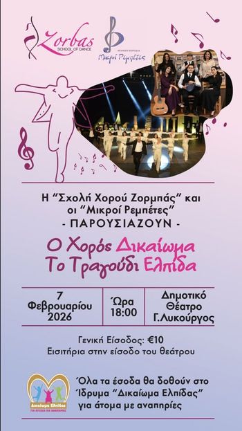 Φιλανθρωπική παράσταση χορού και μουσικής στη Λευκωσία — 7 Φεβρουαρίου 2026. Πολιτισμός με μήνυμα ελπίδας. Εισιτήρια διαθέσιμα. Scroll down for English version 👇 Μέσα από τον χορό και το τραγούδι, η Σχολή Χορού Ζορμπάς και οι Μικροί Ρεμπέτες παρουσιάζουν μια βραδιά αφιερωμένη στον άνθρωπο, τον πολιτισμό και την ελπίδα. Η εκδήλωση φιλοξενείται στο Δημοτικό Θέατρο Γ. Λυκούργος στη Λευκωσία και συνδυάζει καλλιτεχνική ποιότητα με ουσιαστικό κοινωνικό μήνυμα. Η παράσταση αναδεικνύει τον χορό ως δικαίωμα και φωνή έκφρασης, με τη συνοδεία εξαιρετικών μουσικών και καλλιτεχνών με βαθιά αναφορά στην ελληνική πολιτιστική παράδοση. Μέσα από κάθε κίνηση και μελωδία, μεταφέρεται ένα μήνυμα στήριξης, ενσυναίσθησης και συλλογικότητας. 💃🎶 Όλα τα έσοδα της βραδιάς θα διατεθούν στο Ίδρυμα «Δικαίωμα Ελπίδας», στηρίζοντας άτομα με αναπηρίες και ενισχύοντας δράσεις κοινωνικής προσφοράς. Μια παράσταση με ουσία, καρδιά και πολιτιστικό αποτύπωμα. ❤️ 🎟️ Γενική είσοδος €10. 🗓️ Πρόγραμμα Σάββατο, 7 Φεβρουαρίου 2026 | 18:00–21:00 (Δημοτικό Θέατρο Γ. Λυκούργος, Λευκωσία) Διοργάνωση: Μικροί Ρεμπέτες Διάρκεια: 3 ώρες EN This dance and music performance in Nicosia, Cyprus, brings together artistic expression and social purpose. Presented by Zorbas Dance School and Mikroi Rebetes, the event takes place at the G. Lykourgos Municipal Theatre on February 7, 2026, highlighting culture as a powerful voice for hope and inclusion. Through movement and song, the performance celebrates dance as a fundamental right and a means of human connection. Accompanied by outstanding musicians rooted in Greek cultural tradition, the evening delivers emotion, depth, and artistic integrity. 💃🎶 All proceeds from the event will be donated to the “Right to Hope” Foundation, supporting people with disabilities and meaningful community initiatives. An inspiring cultural night with heart, purpose, and impact. ❤️ 🎟️ General admission €10. 🗓️ Schedule Saturday, February 7, 2026 | 18:00–21:00 (G. Lykourgos Municipal Theatre, Nicosia) Organized by: Mikroi Rebetes Duration: 3 hours Explore more Live Shows & Comedy → eventor.com.cy/events/category/live-shows---comedy-148 ❓ FAQ Q: What type of event is this? A: A charity dance and music performance with cultural and social focus. Q: Where does the event take place? A: At the G. Lykourgos Municipal Theatre in Nicosia. Q: Who benefits from the event proceeds? A: All proceeds support the “Right to Hope” Foundation. Q: How long is the performance? A: The total duration is approximately three hours.