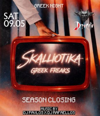 Skalliotika x Greek Freaks season closing at Dracula Club in Larnaca — Greek night with DJ Pavlos & DJ Rafaellos, May 2026. €10 at the door. --- Scroll down for English version 👇 --- Οι Skalliotika ενώνουν δυνάμεις με τους Greek Freaks για το τελευταίο πάρτυ της σεζόν στο Dracula Club στη Λάρνακα. Μια ελληνική βραδιά-season closing που δεν γίνεται να χάσεις, με τους DJ Pavlos και DJ Rafaellos στα decks. 🎟️ Εισιτήρια από €10 (στην πόρτα). Οι πόρτες ανοίγουν στις 22:00. 🗓️ Πρόγραμμα Σάββατο, 9 Μαΐου 2026 | 22:00 (Dracula Club, Λάρνακα) Τηλέφωνο: 99210222 ❓ Συχνές Ερωτήσεις Ε: Χρειάζεται κράτηση; Α: Για RSVP καλέστε στο 99210222. Ε: Πού αγοράζω εισιτήριο; Α: Τα εισιτήρια πωλούνται στην πόρτα (€10). --- EN Skalliotika joins forces with Greek Freaks for the ultimate season closing party at Dracula Club in Larnaca, Cyprus. A Greek night you won't want to miss, with DJ Pavlos and DJ Rafaellos on the decks. 🎟️ Ticket prices start from €10 (at the door). Doors open at 22:00. 🗓️ Schedule Saturday, May 9, 2026 | 22:00 (Dracula Club, Larnaca) Phone: 99210222 ❓ FAQ Q: Do I need a reservation? A: For RSVP call 99210222. Q: Where do I buy tickets? A: Tickets are available at the door (€10). Explore more Nightlife & Parties → eventor.com.cy/events/category/nightlife---parties-128