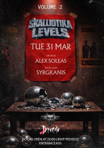 Skalliotika x Levels Vol.2 returns to Dracula Club on March 31, 2026 from 22:00, with Alex Soleas on decks and special guest Syrgkanis. Entry €10. --- Scroll down for English version 👇 --- Το Skalliotika x Levels επιστρέφει για το δεύτερο κεφάλαιο της ιστορίας του — την Τρίτη 31 Μαρτίου 2026 στο Dracula Club, με έναρξη στις 22:00. Μια νύχτα αφιερωμένη σε όσους αντέχουν, με τον Alex Soleas στα decks και special guest τον Syrgkanis. 🎟️ Εισιτήρια από €10. 🗓️ Πρόγραμμα Τρίτη, 31 Μαρτίου 2026 | Έναρξη 22:00 (Dracula Club) Τηλέφωνο/Κρατήσεις: 99210222 --- EN Skalliotika x Levels returns for Vol.2 at Dracula Club, Cyprus on Tuesday, March 31, 2026 from 22:00. Alex Soleas takes the decks for the night, joined by special guest Syrgkanis for a party built for those who can keep up. 🎟️ Ticket prices start from €10. 🗓️ Schedule Tuesday, March 31, 2026 | Starts 22:00 (Dracula Club) Phone/Reservations: 99210222 Explore more Nightlife & Parties → eventor.com.cy/events/category/nightlife---parties-128 --- ❓ FAQ Q: Who is performing at Skalliotika x Levels Vol.2? A: Alex Soleas is on the decks, with Syrgkanis appearing as special guest. Q: What is the entry price? A: Entry is €10. Q: What time does the event start? A: The night kicks off at 22:00 on Tuesday, March 31, 2026. Q: How do I make a reservation? A: Call or text 99210222 for information and reservations.