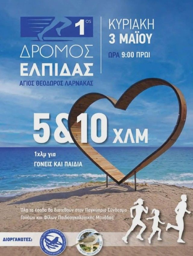 Αγώνας δρόμου 1χλμ, 5χλμ & 10χλμ από τους Thyella Runners στον Άγιο Θεόδωρο Λάρνακας, 3 Μαΐου 2026 στις 09:00. Τα έσοδα υποστηρίζουν παιδιά με καρκίνο. --- Scroll down for English version 👇 --- Την Κυριακή 3 Μαΐου 2026 στις 09:00, οι Thyella Runners διοργανώνουν έναν φιλανθρωπικό αγώνα δρόμου στον Άγιο Θεόδωρο Λάρνακας, με αποστάσεις 1 χλμ, 5 χλμ και 10 χλμ. Στόχος είναι η συγκέντρωση χρημάτων και η ευαισθητοποίηση του κοινού για τον παιδικό και εφηβικό καρκίνο. Όλα τα έσοδα από εγγραφές και χορηγίες δίνονται στην Παγκύπρια Ένωση Γονέων και Φίλων της Παιδοογκολογικής Μονάδας, η οποία στέκεται δίπλα στα παιδιά και τις οικογένειές τους που αντιμετωπίζουν τον καρκίνο στη Μονάδα Παιδοογκολογίας του Νοσοκομείου Μακάριου. Η ιδέα είναι απλή: έρχεσαι, τρέχεις και μετατρέπεις τη συμμετοχή σου σε δύναμη και ελπίδα για τα παιδιά που δίνουν τη δική τους μάχη. 🗓️ Πρόγραμμα Κυριακή, 3 Μαΐου 2026 | 09:00 (Άγιος Θεόδωρος, Λάρνακα) Για περισσότερες πληροφορίες και εγγραφές, επικοινωνήστε απευθείας με τους διοργανωτές. --- EN This charity run in Larnaca, Cyprus is organised by Thyella Runners on Sunday, May 3, 2026 at 09:00 in Agios Theodoros, Larnaca. Participants can choose from three distances — 1km, 5km, or 10km — in a race dedicated to raising funds and awareness for childhood and adolescent cancer. All proceeds from registrations and sponsorships are donated directly to the Pancyprian Association of Parents and Friends of the Pediatric Oncology Unit, which provides consistent support to the children and families monitored or hospitalised at the Pediatric Oncology Unit of Makarios Hospital. The premise is straightforward: you come, you run, and your participation becomes strength and hope for children fighting their own battle. 🗓️ Schedule Sunday, May 3, 2026 | 09:00 (Agios Theodoros, Larnaca) For more information and registration details, please contact the organiser directly. Explore more Sports & Fitness → eventor.com.cy/events/category/sports---fitness-111 --- ❓ FAQ Q: When and where does the Thyella Runners Charity Run take place? A: The run takes place on Sunday, May 3, 2026 at 09:00 in Agios Theodoros, Larnaca. Q: What distances are available? A: Participants can choose from 1km, 5km, or 10km distances. Q: Who do the proceeds support? A: All proceeds go to the Pancyprian Association of Parents and Friends of the Pediatric Oncology Unit, supporting families of children at the Pediatric Oncology Unit of Makarios Hospital. Q: How do I register? A: Contact the organisers directly for registration details.