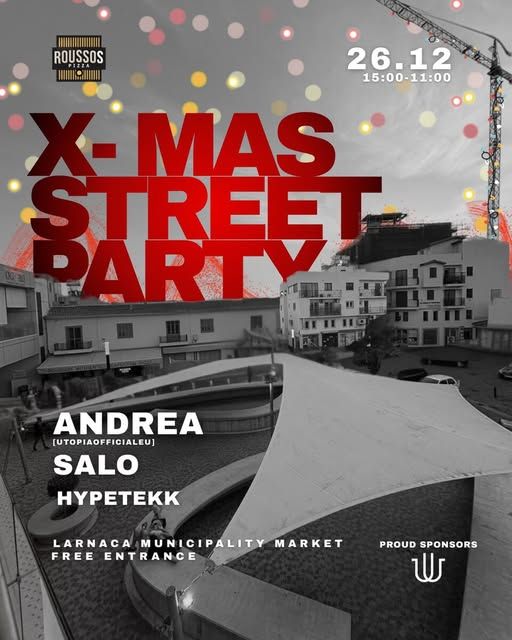 Christmas street party in Larnaca, Cyprus — December 26, 2025. Open-air music, food, drinks and festive vibes at the Municipal Market. Free entry. Scroll down for English version ⯆ Η καρδιά της Λάρνακας γεμίζει ρυθμό, μουσική και γιορτινή ενέργεια με το X-Mas Street Party στη Δημοτική Αγορά. Την Παρασκευή 26 Δεκεμβρίου 2025, ο χώρος μεταμορφώνεται σε ένα ανοιχτό street celebration, ιδανικό για να συνεχιστεί το χριστουγεννιάτικο κλίμα μετά τα Χριστούγεννα. 🎟️ Δωρεάν είσοδος. Από τις 15:00 μέχρι αργά το βράδυ, το event φέρνει μαζί του έντονη street ενέργεια, καλή μουσική και ζεστή, κοινοτική ατμόσφαιρα. Στα decks ανεβαίνουν οι Andrea (Utopiaofficialeu), Salo και Hypetekk, προσφέροντας ένα δυναμικό μουσικό ταξίδι με σύγχρονους ρυθμούς και party διάθεση 🎶 Με φαγητό, ποτό και την υπογραφή της Roussos Pizza, το X-Mas Street Party αποτελεί την τέλεια αφορμή για να συναντηθούμε στο κέντρο της πόλης, να χαλαρώσουμε και να γιορτάσουμε όλοι μαζί σε ένα αυθεντικό open-air περιβάλλον. 🗓️ Πρόγραμμα Παρασκευή, 26 Δεκεμβρίου 2025 | 15:00–23:00 Larnaca Municipality Market, Λάρνακα EN The heart of Larnaca, Cyprus, comes alive with festive energy at the X-Mas Street Party on Friday, December 26, 2025. Hosted at the Larnaca Municipality Market, this open-air celebration brings music, food, and community vibes to the city centre. 🎟️ Free entry. From 3:00 PM until late, the market turns into a lively street gathering filled with holiday spirit and upbeat sounds. The lineup features Andrea (Utopiaofficialeu), Salo, and Hypetekk, delivering an energetic musical journey perfect for a post-Christmas celebration 🎧 With quality music, food and drinks powered by Roussos Pizza, and a warm community atmosphere, the X-Mas Street Party is the perfect way to spend the evening with friends and locals in the heart of the city. 🗓️ Schedule Friday, December 26, 2025 | 15:00–23:00 Larnaca Municipality Market, Larnaca Explore more Food & Drinks → eventor.com.cy/events/category/food---drink-events-165 ❓ FAQ Q: Where does the X-Mas Street Party take place? A: At the Larnaca Municipality Market. Q: Is there an entrance fee? A: No, entry is free. Q: What kind of music can I expect? A: A mix of energetic street and electronic sounds by local DJs. Q: What time does the event start and end? A: From 15:00 until 23:00.