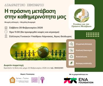 Ανακαλύψτε ένα δωρεάν σεμινάριο στη Λάρνακα τον Φεβρουάριο 2026 για την πράσινη μετάβαση, την κλιματική αλλαγή και την κυκλική οικονομία. Ελεύθερη είσοδος. Scroll down for English version 👇 Το Ίδρυμα Λαόνα και ο Σύλλογος Γυναικών Υπαίθρου Λάρνακας σας προσκαλούν σε ένα δωρεάν σεμινάριο στη Λάρνακα, το Σάββατο 28 Φεβρουαρίου 2026, στις 11:00, στο οίκημα του Συλλόγου Γυναικών στον Άγιο Θεόδωρο. Η συνάντηση εστιάζει στο πώς η πράσινη μετάβαση μπορεί να ενταχθεί ουσιαστικά στην καθημερινότητά μας. 🎟️ Δωρεάν είσοδος. Κατά τη διάρκεια του σεμιναρίου θα παρουσιαστούν βασικές έννοιες που αφορούν την πράσινη μετάβαση, την κλιματική αλλαγή, την κυκλική οικονομία και τη βιώσιμη ανάπτυξη, με πρακτική προσέγγιση για το πώς μπορούν να επηρεάσουν θετικά τις καθημερινές μας επιλογές και την τοπική κοινωνία. Το σεμινάριο πραγματοποιείται στο πλαίσιο του έργου «Γυναίκες για την Πράσινη Μετάβαση» με τη χρηματοδότηση του ENA Foundation. Θα προσφερθεί καφές και κέρασμα στους συμμετέχοντες. 🗓️ Πρόγραμμα Σάββατο, 28 Φεβρουαρίου 2026 | 11:00–14:00 (Οίκημα Συλλόγου Γυναικών, Άγιος Θεόδωρος, Λάρνακα) Τηλέφωνο για πληροφορίες και δηλώσεις συμμετοχής: +357 99432481 EN This free seminar in Larnaca, Cyprus takes place on Saturday, February 28, 2026 at 11:00 at the Women’s Association building in Agios Theodoros, focusing on how green transition principles can be applied in everyday life. 🎟️ Free entry. Participants will be introduced to key concepts related to green transition, climate change, circular economy and sustainable development, with practical insights into how these ideas can benefit daily routines and local communities. The seminar is organised by Laona Foundation and the Rural Women of Larnaca Association within the framework of the project “Women for the Green Transition”, funded by the ENA Foundation. Coffee and light refreshments will be offered. 🗓️ Schedule Saturday, February 28, 2026 | 11:00–14:00 (Women’s Association Building, Agios Theodoros, Larnaca) Phone (for information and participation): +357 99432481 Explore more Free Events → eventor.com.cy/events/category/free-events-161 ❓ FAQ Q: Is there an entry fee for the seminar? A: No, participation is free of charge. Q: How can I declare my participation? A: You can call +357 99432481 for information and participation. Q: Where does the seminar take place? A: At the Women’s Association building in Agios Theodoros, Larnaca. Q: Will refreshments be provided? A: Yes, coffee and light treats will be offered.