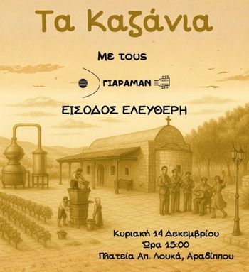 Παραδοσιακή γιορτή καζανιών στην Αραδίππου — 14 Δεκεμβρίου 2025 στην πλατεία Αποστόλου Λουκά. Ζιβανία, μουσική, χοροί & μεζέδες. Ελεύθερη είσοδος. Scroll down for English version ⯆ Το ΕΡΜΗΣ ΦΕΣΤ Winter Edition αναβιώνει μια από τις πιο αυθεντικές κυπριακές παραδόσεις: τα καζάνια. Η διαδικασία της απόσταξης ζιβανίας, βαθιά ριζωμένη στην κυπριακή ύπαιθρο, αποτελεί εδώ και γενιές μια τελετουργία χαράς, συνύπαρξης και φιλοξενίας. Στην κεντρική πλατεία Αποστόλου Λουκά στην Αραδίππου, συγγενείς και φίλοι συγκεντρώνονται γύρω από το καζάνι, δοκιμάζουν τη φρεσκοαπόστακτη ζιβανία, απολαμβάνουν μεζέδες και γιορτάζουν την έναρξη της νέας παραγωγής. Με άφθονη ζιβανία, παραδοσιακή μουσική, χορούς, ζεστό παλουζέ, κρασί και άλλες λιχουδιές, η εκδήλωση αποτυπώνει την αυθεντικότητα και την καρδιά της κυπριακής φιλοξενίας. Μαζί μας το μουσικό σχήμα Γιαραμάν για να ζεστάνει την ατμόσφαιρα με ζωντανές παραδοσιακές μελωδίες. 🎶🔥 🎟️ Δωρεάν είσοδος 🗓️ Πρόγραμμα Κυριακή, 14 Δεκεμβρίου 2025 | 15:00 Τοποθεσία: Πλατεία Αποστόλου Λουκά, Αραδίππου Πληροφορίες: 24534257, 99906626 Διοργανωτές: Καφενείον Ερμής & Π.Ο. Ερμής Αραδίππου EN Ermis Fest Winter Edition brings to life one of Cyprus’ most cherished traditions: the Kazania — the communal ritual of Zivania distillation. A celebration passed down through generations, it highlights togetherness, flavour and authentic Cypriot hospitality. At Apostle Loukas Square in Aradippou, visitors gather around the cauldron, taste freshly distilled zivania, enjoy local bites and celebrate the beginning of the new production season. Expect abundant zivania, traditional music, folk dancing, warm palouzes, wine and many handmade delights. The band Yaraman joins the event with live rhythms, completing the festive atmosphere. 🎶🔥 🎟️ Free entry 🗓️ Schedule Sunday, December 14, 2025 | 15:00 Location: Apostle Loukas Square, Aradippou Info: 24534257, 99906626 Organisers: Kafeneion Ermis & P.O. Ermis Aradippou Explore more Food & Drinks → eventor.com.cy/events/category/food---drink-events-165 ❓ FAQ Q: Is there an entrance fee? A: No, the event is free for all visitors. Q: What is Kazania? A: The traditional process of distilling zivania, celebrated as a social and cultural gathering in Cyprus. Q: Will there be food and drinks? A: Yes — traditional meze, wine, warm palouzes and fresh zivania. Q: Where does the event take place? A: At Apostle Loukas Square in Aradippou.