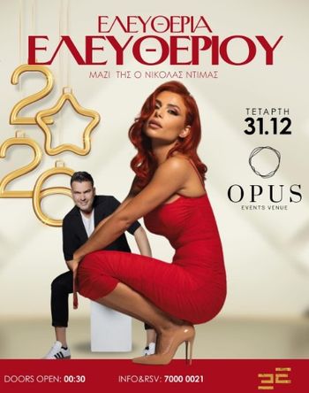 Πρωτοχρονιάτικο live στη Λεμεσό — 31 Δεκεμβρίου 2025. Ελευθερία Ελευθερίου & Νικόλας Ντίμας στο OPUS. Κρατήσεις απαραίτητες. Scroll down for English version 👇 Η Ελευθερία Ελευθερίου υποδέχεται τη νέα χρονιά με ένα λαμπερό live show στη Λεμεσό, στο OPUS Events Venue. Την Τετάρτη 31 Δεκεμβρίου, μαζί της στη σκηνή ο Νικόλας Ντίμας, σε μια βραδιά γεμάτη μουσική, ενέργεια και εορταστική ατμόσφαιρα για την αλλαγή του χρόνου. 🎟️ €50 το άτομο (κάθε 4 άτομα περιλαμβάνεται 1 μπουκάλι). Το πρωτοχρονιάτικο event συνδυάζει live ελληνική μουσική, premium venue εμπειρία και δυνατά vibes μέχρι τις πρώτες ώρες του νέου έτους. Ιδανική επιλογή για όσους θέλουν να γιορτάσουν την αλλαγή του χρόνου με στυλ και live performances. Οι πόρτες ανοίγουν μετά τα μεσάνυχτα, με περιορισμένες θέσεις και απαραίτητη κράτηση εκ των προτέρων. 🗓️ Πρόγραμμα Τετάρτη, 31 Δεκεμβρίου 2025 | Πόρτες ανοίγουν 00:30 (OPUS Events Venue, Λεμεσός) Πληροφορίες & Κρατήσεις: 7000 0021 EN A New Year’s Eve live music event in Limassol, Cyprus, featuring Eleftheria Eleftheriou with Nikolas Ntimas at OPUS Events Venue. On December 31, celebrate the arrival of the new year with a festive night of live Greek music and an upscale party atmosphere. 🎟️ €50 per person (1 bottle included per group of 4). This special NYE event combines live performances, a premium venue setting and a vibrant crowd ready to welcome the new year in style. Ideal for groups, couples and music lovers looking for a high-end celebration. Doors open after midnight, and reservations are strongly recommended due to limited availability. 🗓️ Schedule Wednesday, December 31, 2025 | Doors open 00:30 (OPUS Events Venue, Limassol) Info & Reservations: 7000 0021 Explore more Concerts & Live Music → eventor.com.cy/events/category/concerts---live-music-114 ❓ FAQ Q: How can I make a reservation? A: Reservations are made by phone at 7000 0021. Q: What is included in the price? A: Entry costs €50 per person, with one bottle included for every group of four. Q: When do doors open? A: Doors open at 00:30, just after midnight. Q: Where does the event take place? A: At OPUS Events Venue in Limassol.