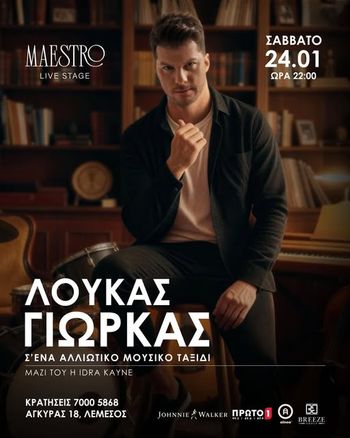 Ο Λούκας Γιώρκας live στη Λεμεσό τον Ιανουάριο με ένα ατμοσφαιρικό μουσικό ταξίδι στο Maestro Live Stage. Scroll down for English version 👇 Ο αγαπημένος καλλιτέχνης Λούκας Γιώρκας έρχεται στη Λεμεσό για μια ξεχωριστή live εμφάνιση στο Maestro Live Stage, προσφέροντας στο κοινό ένα ατμοσφαιρικό μουσικό ταξίδι γεμάτο συναίσθημα και αγαπημένες ερμηνείες. Η βραδιά κινείται σε πιο προσωπικούς και λυρικούς τόνους, με έμφαση στη σύνδεση καλλιτέχνη και κοινού. Τον Λούκα Γιώρκα συνοδεύει το μουσικό σχήμα Ήδρυα Καύνε, δημιουργώντας ένα ζεστό live περιβάλλον που αναδεικνύει τόσο τις γνωστές επιτυχίες όσο και πιο εσωτερικές μουσικές στιγμές. Η εμφάνιση εντάσσεται στο πρόγραμμα του Maestro Live Stage, γνωστό για τις ποιοτικές ζωντανές παραστάσεις του. 🎶 🗓️ Πρόγραμμα Σάββατο, 24 Ιανουαρίου | 22:00 (Maestro Live Stage, Limassol) Phone (κρατήσεις): 7000 5868 Διεύθυνση: Αγκύρας 18, Λεμεσός EN This live music performance in Limassol, Cyprus takes place on Saturday, January 24, featuring Loukas Giorkas in an intimate concert setting at Maestro Live Stage. The show presents a lyrical musical journey shaped by emotion, melody and close interaction with the audience. Accompanied by the band Hydria Kaune, Loukas Giorkas delivers a carefully crafted live experience that blends well-known songs with more reflective moments. The evening is designed for audiences who appreciate expressive performances and a refined live atmosphere. 🎶 🗓️ Schedule Saturday, January 24 | 22:00 (Maestro Live Stage, Limassol) Phone (reservations): 7000 5868 Address: Agkyras 18, Limassol Explore more Concerts & Live Music → eventor.com.cy/events/category/concerts---live-music-114 ❓ FAQ Q: What type of music will be performed? A: Live Greek music with an atmospheric and lyrical character. Q: Where does the concert take place? A: At Maestro Live Stage in Limassol. Q: What time does the event start? A: The performance starts at 22:00. Q: How can I make a reservation? A: Reservations are available by phone.