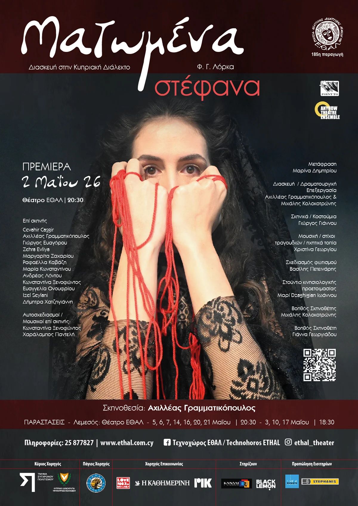 Ματωμένα Στέφανα — ο Λόρκα στην κυπριακή διάλεκτο, στο Θέατρο ΕΘΑΛ στη Λεμεσό, Μάιος 2026. Εισιτήρια διαθέσιμα. --- Scroll down for English version 👇 --- Η ΕΘΑΛ παρουσιάζει τα «Ματωμένα Στέφανα», διασκευή του «Bodas de Sangre» του Φεδερίκο Γκαρθία Λόρκα στην κυπριακή διάλεκτο, στο Θέατρο ΕΘΑΛ στη Λεμεσό. Σε σκηνοθεσία Αχιλλέα Γραμματικόπουλου, η παράσταση αποτελεί συνεργασία με Point To Contemporary Theater και Anyhow Theatre Ensemble. 🎟️ Εισιτήρια από €7 (Ευρωπαϊκή Κάρτα Νέων) | €10 μειωμένο | €15 κανονικό. Η πλοκή μεταφέρεται σε ένα μεικτό χωριό της Κύπρου στις αρχές της δεκαετίας του 1960, όπου ο έρωτας και ο θάνατος συναντούν την πολιτική και κοινωνική διαίρεση. Ένας γάμος ανάμεσα σε δύο οικογένειες διαφορετικής εθνοτικής προέλευσης μετατρέπεται σε πεδίο σύγκρουσης, έρωτα και αίματος. Η παράσταση φέρνει στη σκηνή ηθοποιούς από τις δύο κοινότητες και αποτελεί μια πράξη πολιτισμικής συμφιλίωσης. Η παράσταση παίζεται στα ελληνικά και τουρκικά στην κυπριακή διάλεκτο, με υπέρτιτλους και στις δύο γλώσσες. Κατάλληλο για άτομα 16+. Διάρκεια: 110 λεπτά χωρίς διάλειμμα. 🗓️ Πρόγραμμα Σάββατο, 2 Μαΐου 2026 | 20:30 — Πρεμιέρα Κυριακή, 3 Μαΐου 2026 | 18:30 Τρίτη, 5 Μαΐου 2026 | 20:30 Τετάρτη, 6 Μαΐου 2026 | 20:30 Πέμπτη, 7 Μαΐου 2026 | 20:30 Κυριακή, 10 Μαΐου 2026 | 18:30 Πέμπτη, 14 Μαΐου 2026 | 20:30 Σάββατο, 16 Μαΐου 2026 | 20:30 Κυριακή, 17 Μαΐου 2026 | 18:30 Τετάρτη, 20 Μαΐου 2026 | 20:30 Πέμπτη, 21 Μαΐου 2026 | 20:30 (Θέατρο ΕΘΑΛ, Λεμεσός) Τηλέφωνο: 25877827 Email: ethallimassol@cytanet.com.cy ❓ Συχνές Ερωτήσεις Ε: Σε ποια γλώσσα παίζεται η παράσταση; Α: Στα ελληνικά και τουρκικά στην κυπριακή διάλεκτο, με υπέρτιτλους και στις δύο γλώσσες. Ε: Υπάρχει διάλειμμα; Α: Όχι, η παράσταση διαρκεί 110 λεπτά χωρίς διάλειμμα. Ε: Υπάρχουν μειωμένα εισιτήρια; Α: Ναι, €10 για μαθητές, φοιτητές, στρατιώτες, ηθοποιούς, ανέργους, ΑΜΕΑ και συνταξιούχους. €7 για κατόχους Ευρωπαϊκής Κάρτας Νέων. Απαιτείται επίδειξη αποδεικτικού στο ταμείο. --- EN ETHAL (Limassol Theatre Development Company) presents "Matomena Stefana" (Blood Wedding), an adaptation of Federico García Lorca's "Bodas de Sangre" in the Cypriot dialect, at the ETHAL Theatre in Limassol, Cyprus. Directed by Achilleas Grammatikopoulos, the production is a collaboration with Point To Contemporary Theater and Anyhow Theatre Ensemble. 🎟️ Ticket prices start from €7 (European Youth Card) | €10 reduced | €15 standard. The plot is set in a mixed village in Cyprus in the early 1960s, where love and death meet political and social division. A wedding between two families of different ethnic origins becomes a battleground of passion, love, and blood. The production brings actors from both communities to the stage and stands as an act of cultural reconciliation. The performance is in Greek and Turkish in the Cypriot dialect, with subtitles in both languages. Suitable for ages 16+. Duration: 110 minutes with no interval. 🗓️ Schedule Saturday, May 2, 2026 | 20:30 — Premiere Sunday, May 3, 2026 | 18:30 Tuesday, May 5, 2026 | 20:30 Wednesday, May 6, 2026 | 20:30 Thursday, May 7, 2026 | 20:30 Sunday, May 10, 2026 | 18:30 Thursday, May 14, 2026 | 20:30 Saturday, May 16, 2026 | 20:30 Sunday, May 17, 2026 | 18:30 Wednesday, May 20, 2026 | 20:30 Thursday, May 21, 2026 | 20:30 (ETHAL Theatre, Limassol) Phone: 25877827 Email: ethallimassol@cytanet.com.cy ❓ FAQ Q: What language is the performance in? A: Greek and Turkish in the Cypriot dialect, with subtitles in both languages. Q: Is there an interval? A: No, the performance runs for 110 minutes without an interval. Q: Are reduced tickets available? A: Yes, €10 for students, soldiers, actors, unemployed, people with disabilities, and pensioners. €7 for European Youth Card holders. Valid ID required at the box office. Explore more Theatre & Cinema → eventor.com.cy/events/category/theatre---cinema-123