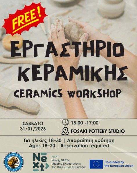 Συμμετέχετε σε ένα δωρεάν βιωματικό εργαστήριο κεραμικής τον Ιανουάριο 2026, ειδικά για νέους που θέλουν να γνωρίσουν την τέχνη του πηλού από το μηδέν. Scroll down for English version 👇 Ανακάλυψε την τέχνη της κεραμικής μέσα από ένα πρακτικό εργαστήριο, ιδανικό για όσους δεν έχουν προηγούμενη εμπειρία. Οι συμμετέχοντες θα δουλέψουν με πηλό και θα δημιουργήσουν το δικό τους χειροποίητο κεραμικό αντικείμενο, μαθαίνοντας βασικές τεχνικές σε ένα φιλικό και δημιουργικό περιβάλλον. Το εργαστήριο φιλοξενείται στο Fosaki Pottery Studio και πραγματοποιείται στο πλαίσιο του έργου NEXT – Young NEETs Shaping Expectations for the Future of Europe, το οποίο συγχρηματοδοτείται από το ευρωπαϊκό πρόγραμμα CERV. Όλα τα υλικά παρέχονται και η συμμετοχή είναι δωρεάν, με περιορισμένο αριθμό θέσεων. 🎟️ Δωρεάν είσοδος. 🗓️ Πρόγραμμα Σάββατο, 31 Ιανουαρίου 2026 | 15:00–17:00 (Fosaki Pottery Studio) Website/Registration: tinyurl.com/y3wwhtwu EN This free pottery workshop offers young adults the chance to explore ceramic art from the ground up. Participants will work with clay and create their own handmade ceramic piece, guided step by step in a relaxed and supportive studio environment—no prior experience required. Hosted at Fosaki Pottery Studio, the workshop is part of the NEXT – Young NEETs Shaping Expectations for the Future of Europe project, co-funded by the EU CERV programme. All materials are provided, and places are limited. 🎟️ Free entry. 🗓️ Schedule Saturday, January 31, 2026 | 15:00–17:00 (Fosaki Pottery Studio) Website/Registration: tinyurl.com/y3wwhtwu Explore more Art & Markets → eventor.com.cy/events/category/art---markets-118 ❓ FAQ Q: Do I need prior experience in ceramics? A: No, the workshop is designed for complete beginners. Q: Who can participate? A: Young adults aged 18–30. Q: Are materials included? A: Yes, all materials are provided. Q: Is registration required? A: Yes, advance registration is required due to limited availability.