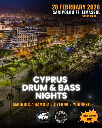 Experience a high-energy drum & bass club night in Limassol this February 2026, featuring local DJs and late-night vibes at Drunk Shooters. Scroll down for English version 👇 Το Cyprus Drum & Bass Nights επιστρέφει στη Λεμεσό για μια βραδιά αφιερωμένη στους δυνατούς ρυθμούς και την ενέργεια της drum & bass σκηνής. Η εκδήλωση φιλοξενείται στο Drunk Shooters, στην καρδιά της πόλης, και συγκεντρώνει φίλους της ηλεκτρονικής μουσικής για ένα αυθεντικό club night. Στα decks θα βρεθούν οι DJs Amorius, Hamsta, CyFunk και Youngzy, προσφέροντας ένα συνεχόμενο σετ από τις 20:00 μέχρι αργά τη νύχτα. Η είσοδος επιτρέπεται μόνο σε άτομα άνω των 18 ετών, ενώ η διοργάνωση γίνεται από το Drumandbass.cy. 🎟️ Εισιτήρια από €8. 🗓️ Πρόγραμμα Σάββατο, 28 Φεβρουαρίου 2026 | 20:00 – Κυριακή, 1 Μαρτίου 2026 | 02:00 (Drunk Shooters, Λεμεσός) 📍 Διεύθυνση: Saripolou 77, Λεμεσός ℹ️ Είσοδος: €10 (μόνο μετρητά) 🔞 Ηλικίες: 18+ Για περισσότερες πληροφορίες και εγγραφές, επικοινωνήστε απευθείας με τους διοργανωτές. EN This drum & bass music event in Limassol, Cyprus brings together DJs and fans for a late-night club experience at Drunk Shooters. Cyprus Drum & Bass Nights showcases local talent with high-energy sets designed for dedicated electronic music lovers. Running from Saturday evening into the early hours of Sunday, the night features DJs Amorius, Hamsta, CyFunk, and Youngzy. Entry is restricted to ages 18+, with cash-only payment at the door. 🎟️ Ticket prices start from €8. 🗓️ Schedule Saturday, February 28, 2026 | 20:00 – Sunday, March 1, 2026 | 02:00 (Drunk Shooters, Limassol) 📍 Address: Saripolou 77, Limassol ℹ️ Entry: €10 (cash only) 🔞 Age limit: 18+ Explore more Nightlife & Parties → eventor.com.cy/events/category/nightlife---parties-128 ❓ FAQ Q: What music style is featured at the event? A: The night focuses on drum & bass music. Q: Who is performing? A: DJs Amorius, Hamsta, CyFunk, and Youngzy. Q: Is there an age restriction? A: Yes, entry is strictly for ages 18 and over. Q: How much is entry at the door? A: Entry is €10, payable in cash only.