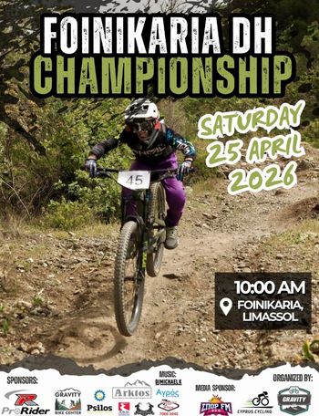 Foinikaria DH National Championship 2026 at Foinikaria DH Track in Limassol on 25 April 2026 — Cyprus' fastest downhill riders battle for the national jersey. Tickets available. --- Scroll down for English version 👇 --- Το Εθνικό Πρωτάθλημα Downhill 2026 διεξάγεται στις 25 Απριλίου 2026, από τις 08:00 έως τις 16:00, στο Foinikaria DH Track στη Λεμεσό. Διοργανώνεται από τη Gravity CY και την Κυπριακή Ομοσπονδία Ποδηλασίας. Μια μέρα γεμάτη αδρεναλίνη, με τους γρηγορότερους αναβάτες του νησιού να αντιμετωπίζουν απότομο, τεχνικό και βραχώδες έδαφος στη μέγιστη ταχύτητα. Στο τέλος της ημέρας θα αναδειχθεί ο ταχύτερος DH αναβάτης της Κύπρου για το 2026, ο οποίος θα φέρει με περηφάνια τη φανέλα του πρωταθλητή για ολόκληρο το χρόνο. Η μουσική επιμέλεια της βραδιάς αναλαμβάνει ο DJ Michael K. 🗓️ Πρόγραμμα Σάββατο, 25 Απριλίου 2026 | 08:00–16:00 (Foinikaria DH Track, Λεμεσός) Για περισσότερες πληροφορίες, επικοινωνήστε απευθείας με τη Gravity CY. ❓ Συχνές Ερωτήσεις Ε: Η εκδήλωση είναι ανοιχτή για θεατές ή μόνο για αναβάτες; Α: Η εκδήλωση είναι ανοιχτή και σε θεατές. Ελάτε να κάνετε θόρυβο και να χειροκροτήσετε τους αναβάτες στη διαδρομή. Ε: Υπάρχει ηλικιακό όριο για τους αγωνιζόμενους; Α: Δεν αναφέρεται στην πηγή. Επικοινωνήστε με τη Gravity CY ή την Κυπριακή Ομοσπονδία Ποδηλασίας για πληροφορίες κατηγοριών. Ε: Πώς φτάνω στο Foinikaria DH Track; Α: Δεν παρέχονται οδηγίες πρόσβασης στην πηγή. Επικοινωνήστε με τους διοργανωτές για λεπτομέρειες τοποθεσίας. --- EN The Foinikaria DH National Championship 2026 takes place at Foinikaria DH Track in Limassol, Cyprus, on Saturday 25 April 2026 from 08:00 to 16:00. Organised by Gravity CY and the Cyprus Cycling Federation, this is the premier downhill mountain biking competition on the island. Fearless riders push their limits on steep, technical, rocky terrain at full speed — all competing to be crowned the fastest downhill rider in Cyprus and earn the right to wear the national champion jersey for the year. DJ Michael K keeps the energy high throughout the day. 🗓️ Schedule Saturday, 25 April 2026 | 08:00–16:00 (Foinikaria DH Track, Limassol) For more information and registration details, please contact Gravity CY directly. ❓ FAQ Q: Is the event open to spectators or only registered riders? A: The event is open to spectators. Come out to make noise and cheer on the riders along the track. Q: Are there age categories for competitors? A: Not specified in the source. Contact Gravity CY or the Cyprus Cycling Federation for details on race categories. Q: How do I get to Foinikaria DH Track? A: Directions are not provided in the source. Contact the organisers directly for location and access details. Explore more Sports & Fitness → eventor.com.cy/events/category/sports---fitness-111