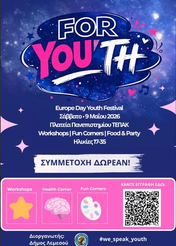 For You(th) Festival at TEPAK Main Square in Limassol — workshops, creative sessions, food trucks and after party, May 2026. Free entry. --- Scroll down for English version 👇 --- Tο For You(th) Festival – Not Another Youth Festival έρχεται στη Λεμεσό και οι εγγραφές μόλις άνοιξαν και είναι ΔΩΡΕΑΝ! Ένα φεστιβάλ για τους νέους με στόχο τη σύνδεση, την ενίσχυση της ψυχικής ευεξίας, και την ανάπτυξη δεξιοτήτων μέσα από: Workshops • Activity Corners • Creative Sessions • NGOs • Small Businesses • Food Trucks • After Party 📍 ΚΕΝΤΡΙΚΗ ΠΛΑΤΕΙΑ ΤΕΠΑΚ 📅 9 Μαΐου 2026 🕚 Ώρα έναρξης: 11 π.μ. 🎫ΕΙΣΟΔΟΣ ΔΩΡΕΑΝ Η συμμετοχή είναι ΔΩΡΕΑΝ και οι θέσεις στα εργαστήρια είναι περιορισμένες. 🔗 Κάνε εγγραφή για τα εργαστήρια στο: forms.gle/eKzjG6cEusbE1s1M6 Αν έχεις μια μικρή επιχείρηση (small business, start-up) και θα ήθελες να προωθήσεις τα προϊόντα σου, έλα στο Youth Festival! Η συμμετοχή είναι ΔΩΡΕΑΝ! 🔗 Κάνε εγγραφή για τις επιχειρήσεις στο: forms.gle/SMyF4nPGn9z8Jc8m8 Αν έχεις food truck και θα ήθελες να προωθήσεις τα προϊόντα σου, έλα στο Youth Festival! Η συμμετοχή είναι ΔΩΡΕΑΝ! 🔗 Κάνε εγγραφή για τα food trucks στο: forms.gle/pcmJA5oex7xxkJaM7 For You(th) Festival Not Another Youth Festival ❓ Συχνές Ερωτήσεις Ε: Χρειάζεται εγγραφή; Α: Η είσοδος είναι δωρεάν, αλλά οι θέσεις στα εργαστήρια είναι περιορισμένες και απαιτείται εγγραφή μέσω της φόρμας. Ε: Μπορώ να συμμετάσχω ως small business ή food truck; Α: Ναι, η συμμετοχή επιχειρήσεων και food trucks είναι δωρεάν. Ξεχωριστές φόρμες εγγραφής διαθέσιμες. Ε: Υπάρχει φαγητό στον χώρο; Α: Ναι, θα υπάρχουν food trucks καθ' όλη τη διάρκεια του φεστιβάλ. --- EN The For You(th) Festival – Not Another Youth Festival is coming to Limassol, and registrations have just opened and are FREE! A festival for young people aimed at connection, strengthening mental well-being, and developing skills through: Workshops • Activity Corners • Creative Sessions • NGOs • Small Businesses • Food Trucks • After Party 📍 TEPAK CENTRAL SQUARE 📅 9 May 2026 🕚 Start time: 11 a.m. 🎫 FREE ENTRY Participation is FREE, and workshop spots are limited. 🔗 Register for the workshops at: forms.gle/eKzjG6cEusbE1s1M6 If you have a small business or start-up and would like to promote your products, come to the Youth Festival! Participation is free! 🔗 Register for businesses at: forms.gle/SMyF4nPGn9z8Jc8m8 If you have a food truck and would like to promote your products, come to the Youth Festival! Participation is free! 🔗 Register for food trucks at: forms.gle/pcmJA5oex7xxkJaM7 For You(th) Festival Not Another Youth Festival ❓ FAQ Q: Is registration required? A: Entry is free, but workshop spots are limited and registration is required via the form. Q: Can I participate as a small business or food truck? A: Yes, business and food truck participation is free. Separate registration forms are available. Q: Is food available on site? A: Yes, food trucks will be present throughout the festival. Explore more Festivals → eventor.com.cy/events/category/festivals-115