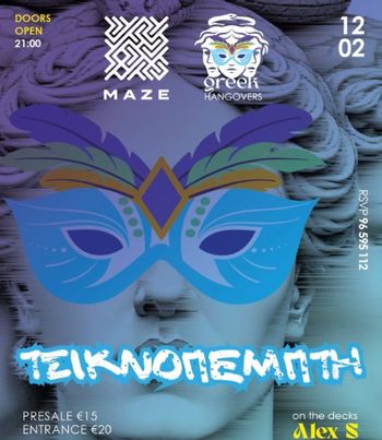 Carnival Tsiknopempti party with Greek Hangovers and DJ Alex Soleas at Maze Venue, featuring music, masks and festive vibes. Tickets available. Scroll down for English version 👇 Το Greek Hangovers φορά τη μάσκα του και σας προσκαλεί σε μια αποκριάτικη Τσικνοπέμπτη που υπόσχεται να μείνει αξέχαστη. Σε έντονο καρναβαλικό κλίμα, η βραδιά φιλοξενείται στο Maze Venue και συνδυάζει ελληνικούς ρυθμούς, χορό και ξέφρενη διάθεση μέχρι αργά. Στα decks θα βρίσκεται ο Alex Soleas, δίνοντας τον ρυθμό για μια νύχτα γεμάτη ενέργεια, μασκαράδες και αποκριάτικο mood. Η εκδήλωση απευθύνεται σε όσους θέλουν να γιορτάσουν την Τσικνοπέμπτη με δυνατή μουσική και καρναβαλική ατμόσφαιρα. 🎟️ Προπώληση €15 | Είσοδος €20. 🗓️ Πρόγραμμα Πέμπτη, 12 Φεβρουαρίου | Πόρτες: 21:00 (Maze Venue) RSVP / Πληροφορίες: 96 595112 EN Greek Hangovers bring their carnival spirit to Maze Venue for a Tsiknopempti party filled with masks, music, and high-energy vibes. The night embraces the festive atmosphere of Carnival, inviting guests to dance and celebrate in a lively club setting. On the decks, DJ Alex Soleas delivers a dynamic soundtrack, setting the tone for a memorable night of Greek party music and carnival mood. This event is ideal for those looking to celebrate Tsiknopempti with style, colour, and nonstop dancing. 🎟️ Pre-sale €15 | Entry €20. 🗓️ Schedule Thursday, February 12 | Doors open: 21:00 (Maze Venue) RSVP / Info: 96 595112 Explore more Carnival Events → eventor.com.cy/events/category/carnival-127 ❓ FAQ Q: What kind of event is this? A: It is a carnival-themed Tsiknopempti party with Greek party music. Q: Who is performing? A: The music will be played by DJ Alex Soleas. Q: What time do doors open? A: Doors open at 21:00. Q: Is there a pre-sale ticket option? A: Yes, pre-sale tickets cost €15, while entry at the door is €20.