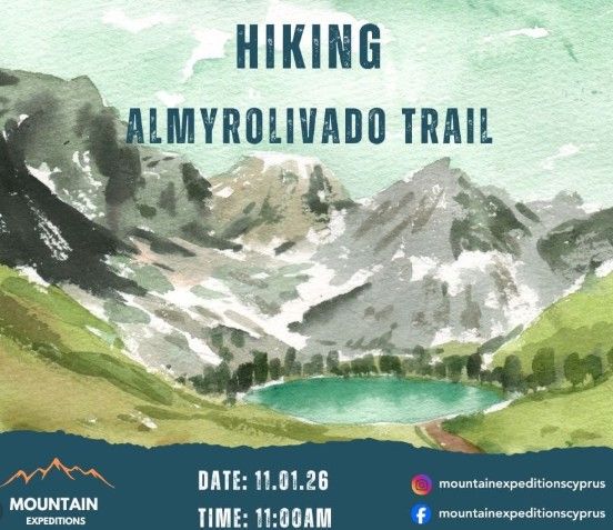 Join a guided hike on the Almyrolivado Trail on January 11, 2026, a scenic winter walk in the Troodos Mountains with moderate difficulty. Scroll down for English version 👇 Μια οργανωμένη πεζοπορία στη φύση που προσφέρει την ευκαιρία να εξερευνήσετε το μονοπάτι Αλμυρολίβαδος, στην ευρύτερη περιοχή του Troodos Mountains. Η διαδρομή είναι γραμμική, με μέτριο βαθμό δυσκολίας (2/3), και απευθύνεται σε άτομα με βασική εμπειρία πεζοπορίας που επιθυμούν να απολαύσουν το χειμερινό τοπίο του βουνού. Η συνολική απόσταση είναι 7,4 χλμ., με υψομετρική διαφορά 277 μέτρα. Το σημείο συνάντησης βρίσκεται κοντά στον Καρβουνά, στον δρόμο Καρβουνά–Τροόδους. Οι συμμετέχοντες καλούνται να είναι κατάλληλα εξοπλισμένοι για χειμερινές συνθήκες και να έχουν μαζί τους τα απαραίτητα για ασφάλεια και άνεση κατά τη διάρκεια της πεζοπορίας. 🗓️ Πρόγραμμα Κυριακή, 11 Ιανουαρίου 2026 | 11:00 Σημείο συνάντησης: Κοντά στον Καρβουνά – Δρόμος Καρβουνά–Τροόδους 📍 Σημείο συνάντησης (χάρτης): maps.app.goo.gl/4mdyJmfRKLme9zoKA?g_st=ic 📞 Τηλέφωνο επικοινωνίας: 95593650 EN This outdoor hiking activity in Cyprus follows the Almyrolivado Trail, set in the scenic Troodos Mountains. The route is linear, with a moderate difficulty level (2/3), making it suitable for hikers with basic experience who enjoy winter mountain walks. The hike covers a distance of 7.4 km with an elevation gain of 277 metres. The meeting point is located near Karvounas, on the Karvounas–Troodos Road. Participants are advised to come well prepared for winter conditions, wearing appropriate clothing and footwear and carrying essential supplies. 🗓️ Schedule Sunday, January 11, 2026 | 11:00 Meeting point: Near Karvounas – Karvounas–Troodos Road 📍 Meeting point (map): maps.app.goo.gl/4mdyJmfRKLme9zoKA?g_st=ic 📞 Contact phone: 95593650 Explore more Outdoor & Adventure → eventor.com.cy/events/category/outdoor---adventure-125 ❓ FAQ Q: How difficult is the hike? A: The trail has a moderate difficulty level, rated 2 out of 3. Q: How long is the route? A: The total distance is 7.4 km. Q: What should I bring with me? A: Water, snacks, waterproof jacket, hiking shoes, warm layers, and optional trekking poles. Q: Where is the meeting point? A: Near Karvounas, on the Karvounas–Troodos Road, at the provided map link.
