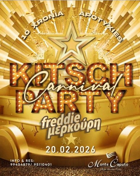 Celebrate Carnival 2026 in Limassol with the 10-year Kitsch Party anniversary, open bar, themed vibes and live performance at Monte Caputo. Scroll down for English version 👇 Το επετειακό Kitsch Party επιστρέφει για να γιορτάσει 10 χρόνια καρναβαλικής υπερβολής στη Λεμεσό, με μια βραδιά αφιερωμένη στη διασκέδαση, το χρώμα και το απόλυτο kitsch. Την Παρασκευή 20 Φεβρουαρίου 2026, το Monte Caputo μεταμορφώνεται σε μια λαμπερή καρναβαλική σκηνή, γεμάτη μουσική, θεατρική αισθητική και εορταστική διάθεση. Η βραδιά περιλαμβάνει open bar και ζωντανή εμφάνιση από τον Φρέντυ Μερκούρη, προσφέροντας ένα ολοκληρωμένο party experience που συνδυάζει τραγούδι, χορό και έντονη διαδραστική ενέργεια. Το event απευθύνεται σε όσους θέλουν να ζήσουν το Καρναβάλι με χιούμορ, λάμψη και ανεπιτήδευτο στυλ. 🎭✨ 🎟️ Εισιτήρια από €60. 🗓️ Πρόγραμμα Παρασκευή, 20 Φεβρουαρίου 2026 | 21:30 (Monte Caputo, Limassol) Phone: 99 454879 / 95 110401 EN This carnival party in Limassol, Cyprus takes place on Friday, February 20, 2026, celebrating 10 years of the iconic Kitsch Party. Hosted at Monte Caputo, the event brings a glamorous, playful Carnival atmosphere designed for an all-out night of fun. The night features an open bar and a live performance by Freddie Mercouri, blending music, performance, and theatrical flair into a high-energy celebration. With its bold aesthetic and festive spirit, the party invites guests to embrace Carnival in true kitsch style. 🎭✨ 🎟️ Ticket prices start from €60. 🗓️ Schedule Friday, February 20, 2026 | 21:30 (Monte Caputo, Limassol) Phone: 99 454879 / 95 110401 Explore more Nightlife & Parties → eventor.com.cy/events/category/nightlife---parties-128 ❓ FAQ Q: Is this a Carnival-themed event? A: Yes, the party is designed as a Carnival 2026 celebration. Q: Does the ticket include drinks? A: Yes, the event features an open bar as stated. Q: Will there be live performances? A: Yes, the night includes a live performance by Freddie Mercouri. Q: What time does the event start? A: The party starts at 21:30.