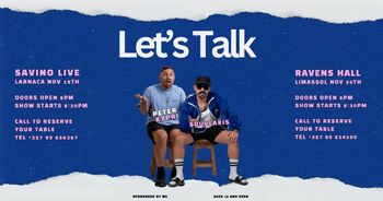 👉 Scroll down for English version Ετοιμαστείτε για το “Let’s Talk”, την πιο διαδραστική και ξεκαρδιστική stand-up παράσταση της χρονιάς, που έρχεται στη Λεμεσό την Πέμπτη, 20 Νοεμβρίου 2025, στο Ravens Music Hall. Μια βραδιά που βουτάει κατευθείαν στο χάος του μυαλού — στις τυχαίες σκέψεις, την υπερανάλυση και όλα όσα μας τρελαίνουν (ή μας κάνουν να γελάμε για αυτά). 🎤 🎟️ Εισιτήρια: €25 (Γενική Είσοδος) 📞 Κρατήσεις: +357 99 614100 📧 Επικοινωνία: ela@cypriotsmurf.com Η παράσταση συνδυάζει stand-up & storytelling με προσωπικές ιστορίες, γέλιο και αλήθειες που όλοι αναγνωρίζουμε. Αλλά αυτό είναι μόνο η αρχή — γιατί στο δεύτερο μέρος, ο Souvlakis κάνει την πρώτη του εμφάνιση στη σκηνή της Κύπρου! Περιμένετε αλληλεπίδραση με το κοινό, απρόβλεπτες στιγμές, και έναν Souvlakis που μεταμορφώνεται σε Έρωτα — σκορπώντας γέλιο, αγάπη και λίγη… τρέλα! 💘 🗓️ Πρόγραμμα: Πέμπτη, 20 Νοεμβρίου 2025 | 20:30 – 22:30 🚪 Οι πόρτες ανοίγουν στις 20:00 📍 Τοποθεσία: Ravens Music Hall, Socratous 4, Λεμεσός 3036 EN Get ready for “Let’s Talk”, a comedy show that dives deep into the chaos inside my head — random thoughts, overthinking, and everything that drives me mad (or makes me laugh about it). It’s a mix of stand-up and storytelling, straight from my brain to yours. But that’s just the beginning — because in the second half, Souvlakis makes his first-ever appearance on stage in Cyprus! Expect wild audience interaction, spontaneous fun, and a night where Souvlakis becomes Cupid himself — spreading laughter, love, and a touch of madness! 💘 🎟️ Tickets: €25 (General Admission) 📞 Reservations: +357 99 614100 📧 Info: ela@cypriotsmurf.com 🗓️ Schedule: Thursday, November 20, 2025 | 8:30pm – 10:30pm 🚪 Doors open: 8:00pm 📍 Venue: Ravens Music Hall, Socratous 4, Limassol 3036, Cyprus A night of humor, storytelling, and connection — come laugh, think, and maybe even fall in love (just a little). Explore more Live Show & Comedy → https://eventor.com.cy/events/category/live-shows---comedy-148 ❓ Micro-FAQ Q: What time does the show start? A: Doors open at 8:00pm, show starts at 8:30pm. Q: How much are tickets? A: General Admission €25. Q: How can I book a table? A: Call +357 99 614100 or email ela@cypriotsmurf.com