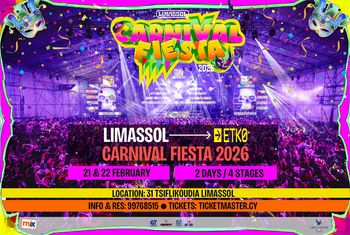 Experience a two-day carnival takeover in Limassol this February 2026, with four stages, immersive activations, and nonstop music at ETKO. Scroll down for English version 👇 Καλωσορίσατε στο ONE CARNIVAL UNIVERSE. Το Limassol Carnival Fiesta 2026 επιστρέφει πιο μεγάλο, πιο δυνατό και πιο πολύχρωμο από ποτέ, μεταμορφώνοντας το ETKO Limassol σε ένα ολοκληρωμένο καρναβαλικό playground. Για δύο ημέρες, τέσσερις μοναδικές σκηνές, νέα concepts και immersive activations συνδυάζουν μουσική, τέχνη, θέατρο και δημιουργικές εμπειρίες σε έναν πολυπολιτισμικό εορτασμό. Η φετινή διοργάνωση φιλοξενεί 15+ brands & activations και αντλεί έμπνευση από τον βιομηχανικό χαρακτήρα και τη σύγχρονη τεχνολογία του χώρου. Από mainstream και ελληνικούς ρυθμούς μέχρι electronic, techno και disco vibes, κάθε σκηνή προσφέρει ξεχωριστή ταυτότητα και ενέργεια. 🎟️ Εισιτήρια από €20. 🗓️ Πρόγραμμα Σάββατο, 21 Φεβρουαρίου 2026 | Έναρξη: 17:00 (ETKO Limassol) MAIN STAGE – Urban Chaos (Mainstream / R&B / Carnival Vibes) Presented by: Ghetto Funk · Urban Vibe · RedSky Cy · Tipsycy ORGANIC STAGE – Egklimata (Greek Music Experience) CARNAVAL AIR STAGE – Love Generation (00s & 10s) BLOOM ROOM STAGE – Insomnia (Electronic / Techno) Κυριακή, 22 Φεβρουαρίου 2026 | Έναρξη: 17:00 (ETKO Limassol) MAIN STAGE – After Carnival Parade 2026 (Mainstream / Greek / Carnival Vibes) Presented by: Plyntirio · Souare · Kapsouremata · Mr Mellow · Amnesia ORGANIC STAGE – The Legendary VERSUS with Manic Mike (Trance / House / Disco) CARNAVAL AIR STAGE – Disco Carnival by Mix FM (Dino G & Phivos Constantinidis) BLOOM ROOM STAGE – Paradise X · Synthbeat · Laura (Techno / Tech House) Τιμές Εισιτηρίων General Admission: €20 VIP: €40 General Admission (2 Days): €30 VIP (2 Days): €70 Tickets: ticketmaster.cy Phone (Info & Reservations): 99768515 EN Welcome to ONE CARNIVAL UNIVERSE. Limassol Carnival Fiesta 2026 returns for two explosive days at ETKO Limassol, delivering a next-level carnival experience with four distinct stages, immersive activations, and a full venue transformation. Inspired by ETKO’s industrial character and modern technology, the fiesta blends mainstream, Greek, electronic, techno, disco, and carnival vibes across multiple stages. With 15+ brands and activations, the event offers nonstop energy, creative concepts, and a truly immersive carnival realm. 🎟️ Ticket prices start from €20. 🗓️ Schedule Saturday, February 21, 2026 | Starts at 17:00 (ETKO Limassol) MAIN STAGE – Urban Chaos (Mainstream / R&B / Carnival Vibes) Presented by: Ghetto Funk · Urban Vibe · RedSky Cy · Tipsycy ORGANIC STAGE – Egklimata (Greek Music Experience) CARNAVAL AIR STAGE – Love Generation (00s & 10s) BLOOM ROOM STAGE – Insomnia (Electronic / Techno) Sunday, February 22, 2026 | Starts at 17:00 (ETKO Limassol) MAIN STAGE – After Carnival Parade 2026 (Mainstream / Greek / Carnival Vibes) Presented by: Plyntirio · Souare · Kapsouremata · Mr Mellow · Amnesia ORGANIC STAGE – The Legendary VERSUS with Manic Mike (Trance / House / Disco) CARNAVAL AIR STAGE – Disco Carnival by Mix FM (Dino G & Phivos Constantinidis) BLOOM ROOM STAGE – Paradise X · Synthbeat · Laura (Techno / Tech House) Ticket Prices General Admission: €20 VIP: €40 General Admission (2 Days): €30 VIP (2 Days): €70 Tickets: ticketmaster.cy Phone (Info & Reservations): 99768515 Explore more Top in Cyprus → eventor.com.cy/events/category/top-events-in-cyprus-139 ❓ FAQ Q: How many stages are there? A: Four stages, each with a different music concept and vibe. Q: Is this a two-day event? A: Yes, the fiesta runs on Saturday and Sunday. Q: Where does the event take place? A: At ETKO Limassol (ETKO Winery area). Q: Are there VIP ticket options? A: Yes, VIP tickets are available for one day or both days.
