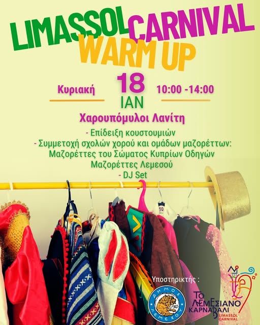 Celebrate Limassol Carnival Warm Up with costumes, dance groups and a DJ set at Lanitis Carob Mill in January 2026. A festive community carnival event in Limassol. Scroll down for English version 👇 Η εκδήλωση Limassol Carnival Warm Up σηματοδοτεί την έναρξη του καρναβαλικού κλίματος στη Λεμεσό, με μια γιορτινή συνάντηση γεμάτη χρώμα, μουσική και αποκριάτικη διάθεση. Την Κυριακή 18 Ιανουαρίου 2026, οι Χαρουπόμυλοι Λανίτη φιλοξενούν μικρούς και μεγάλους σε μια ανοιχτή καρναβαλική εκδήλωση της κοινότητας. Το πρόγραμμα περιλαμβάνει επίδειξη κοστουμιών, συμμετοχή σχολών χορού και ομάδων μαζορετών, καθώς και DJ set που θα κρατήσει τον ρυθμό ζωντανό καθ’ όλη τη διάρκεια της εκδήλωσης. Πρόκειται για μια οικογενειακή, εξωστρεφή δραστηριότητα που προετοιμάζει την πόλη για τις μεγάλες καρναβαλικές εκδηλώσεις που ακολουθούν. 🗓️ Πρόγραμμα Κυριακή, 18 Ιανουαρίου 2026 | 10:00–14:00 (Χαρουπόμυλοι Λανίτη, Λεμεσός) Για περισσότερες πληροφορίες και εγγραφές, επικοινωνήστε απευθείας με τους διοργανωτές. EN This community carnival event in Limassol, Cyprus, marks the festive warm-up to the city’s annual carnival celebrations. Taking place on Sunday, January 18, 2026, at Lanitis Carob Mill, the Limassol Carnival Warm Up brings together colour, music, and carnival spirit in a lively outdoor setting. The event features a costume showcase, participation from dance schools and majorette groups, and a DJ set that creates a joyful atmosphere throughout the morning. Designed for families and the wider community, it offers a relaxed and cheerful introduction to the Limassol Carnival season. 🗓️ Schedule Sunday, January 18, 2026 | 10:00–14:00 (Lanitis Carob Mill, Limassol) For more information and registration details, please contact the organiser directly. ❓ FAQ Q: Is this event suitable for children? A: Yes, the event is community-oriented and suitable for families with children. Q: Does the event include live performances? A: Yes, the programme includes dance schools, majorette groups, and a DJ set. Q: Where does the event take place? A: It takes place at Lanitis Carob Mill in Limassol. Q: Is registration required? A: No registration details are provided; please contact the organisers directly for information.