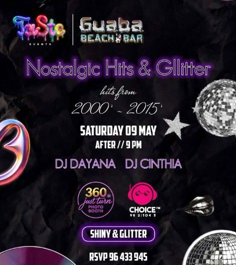 A night of 2000s–2015 nostalgia hits at a Limassol venue on Saturday 9 May 2026, 21:00 — DJ Dayana & DJ Cinthia, Glitter Bar, 360 Photo Booth. €20 including a drink. --- Scroll down for English version 👇 --- Μια βραδιά αφιερωμένη στις μεγαλύτερες επιτυχίες της εποχής 2000–2015 διοργανώνεται στη Λεμεσό, το Σάββατο 9 Μαΐου 2026 στις 21:00. Οι DJ Dayana και DJ Cinthia αναλαμβάνουν τη μουσική ολόκληρη τη βραδιά. Dress code: Shiny & Glitter. 🎟️ Εισιτήρια από €20 (συμπεριλαμβάνεται ένα ποτό). Η βραδιά περιλαμβάνει Glitter Bar για να λάμπετε όλη νύχτα, 360 Experience Photo Booth και μουσική υποστήριξη από το @choicefmcyprus. 🗓️ Πρόγραμμα Σάββατο, 9 Μαΐου 2026 | 21:00 (Λεμεσός) Τηλέφωνο (RSVP & πληροφορίες): 96433945 ❓ Συχνές Ερωτήσεις Ε: Απαιτείται προκράτηση; Α: Ναι, συνιστάται RSVP στο 96433945 για εξασφάλιση θέσης. Ε: Υπάρχει dress code; Α: Ναι, ο dress code είναι Shiny & Glitter — όσο πιο λαμπερά τόσο το καλύτερο. Ε: Υπάρχει ηλικιακό όριο εισόδου; Α: Δεν αναφέρεται στην πηγή. Επικοινωνήστε στο 96433945 για διευκρινίσεις. --- EN A nostalgia party night dedicated to the biggest hits from 2000 to 2015 takes place in Limassol, Cyprus, on Saturday 9 May 2026 at 21:00, organised by Taste. Music all night long by DJ Dayana and DJ Cinthia, powered by Choice FM Cyprus. Dress code: Shiny & Glitter. 🎟️ Ticket prices start from €20, including one drink. The night features a Glitter Bar to keep you sparkling all evening and a 360 Experience Photo Booth. Whether you grew up screaming these songs in the car or ruling the dancefloor, this is a night built around the tracks that defined a generation. 🗓️ Schedule Saturday, 9 May 2026 | 21:00 (Limassol) Phone (RSVP & info): 96433945 ❓ FAQ Q: Is advance booking required? A: RSVP is recommended. Contact 96433945 to secure your spot. Q: Is there a dress code? A: Yes — Shiny & Glitter. The more sparkle the better. Q: Is there an age restriction? A: Not stated in the source. Contact the organiser on 96433945 for clarification. Explore more Nightlife & Parties → eventor.com.cy/events/category/nightlife---parties-128