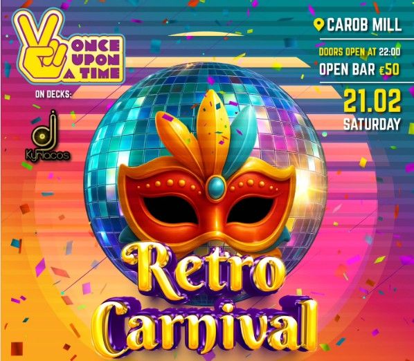 Dance through the decades at Once Upon a Time Retro Carnival in Limassol, with 80s–00s hits, open bar, costumes and nonstop dancing. Scroll down for English version 👇 Το Once Upon a Time Retro Carnival επιστρέφει για να χαρίσει στη Λεμεσό μια αξέχαστη αποκριάτικη βραδιά γεμάτη λάμψη, ρυθμό και νοσταλγία. Όταν ανάβουν τα φώτα και αρχίζει να γυρίζει η disco ball, το Carob Mill μετατρέπεται στο απόλυτο dancefloor με retro αίσθηση. Με μουσικές επιτυχίες από τις δεκαετίες των 80s, 90s και 00s, η βραδιά προσκαλεί το κοινό να φορέσει τις στολές του, να ετοιμάσει τις καλύτερες χορευτικές κινήσεις και να απολαύσει μια εμπειρία γεμάτη κέφι και αποκριάτικη ενέργεια. Στα decks ο DJ Kyriacos, έτοιμος να κρατήσει τον ρυθμό ψηλά μέχρι αργά. 🪩 🎟️ Εισιτήρια από €50 (Open Bar). 🗓️ Πρόγραμμα Σάββατο, 21 Φεβρουαρίου 2026 | 22:00 (Carob Mill, Limassol) Κρατήσεις & Πληροφορίες: 99 588 828 EN Once Upon a Time Retro Carnival brings a full retro vibe to Limassol, Cyprus, transforming Carob Mill into a vibrant carnival dancefloor. The night celebrates music from the 80s, 90s, and 00s, blending nostalgia with high-energy party spirit. With DJ Kyriacos behind the decks, an open bar experience, and costumes strongly encouraged, the event invites guests to dance, dress up, and fully embrace the carnival mood. Designed as an annual highlight, this retro party promises colour, rhythm, and nonstop movement until late. 🕺 🎟️ Ticket prices start from €50 (open bar). 🗓️ Schedule Saturday, February 21, 2026 | 22:00 (Carob Mill, Limassol) Tickets & RSVP: 99 588 828 Explore more Nightlife & Parties → eventor.com.cy/events/category/nightlife---parties-128 ❓ FAQ Q: What music will be played? A: Hits from the 1980s, 1990s, and 2000s. Q: Is there an open bar? A: Yes. The ticket includes an open bar. Q: Are costumes required? A: Costumes are encouraged to match the carnival theme. Q: Where does the event take place? A: At Carob Mill in Limassol.