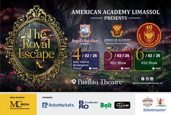 Family theatre show in Limassol, Cyprus — Feb 4–6, 2026. The Royal Escape by American Academy celebrates 40 years. Tickets available. Scroll down for English version 👇 Μια μαγευτική χειμερινή παράσταση γεμάτη φαντασία, περιπέτεια και παραμυθένια μαγεία ανεβαίνει στη σκηνή του Παττίχειου Δημοτικού Θεάτρου Λεμεσού. Το Ιδιωτικό Δημοτικό Σχολείο American Academy Λεμεσού γιορτάζει 40 χρόνια μάθησης και δημιουργίας με το έργο “The Royal Escape”, μια πρωτότυπη ιστορία όπου τα κλασικά παραμύθια αποκτούν σύγχρονη φωνή. Η Χιονάτη, η Πεντάμορφη και η Ωραία Κοιμωμένη σπάνε τα δεσμά των παραδοσιακών τους ρόλων και ξεκινούν μια τολμηρή αποστολή γεμάτη μυστήριο, γρίφους και μαγικές ανατροπές. Αντιμέτωπες με τον πανούργο Ρουμπελστίλτσκιν και υπό το άγρυπνο βλέμμα της Κακιάς Βασίλισσας, ανακαλύπτουν πως η αληθινή δύναμη γεννιέται από το θάρρος, τη φιλία και την πίστη στον εαυτό τους. ✨ Η παράσταση γράφτηκε, οργανώθηκε και σκηνοθετήθηκε από τον Μουσικό Συντονιστή Φίλιππο Φιλίππου με τη συνεργασία της ομάδας Winter Show και ολόκληρης της σχολικής κοινότητας. Συμμετέχουν μαθητές από το Νηπιαγωγείο έως και το Λύκειο, πλαισιωμένοι από εντυπωσιακές χορογραφίες και ζωντανή σκηνική ενέργεια. 🎭 Όλα τα έσοδα θα διατεθούν στο φιλανθρωπικό ίδρυμα «Μικροί Ήρωες». 🎟️ Εισιτήρια από €10 Ticketmaster Cy. 🗓️ Πρόγραμμα Τετάρτη, 4 Φεβρουαρίου 2026 | 18:00–20:00 (Παττίχειο Δημοτικό Θέατρο Λεμεσού) Πέμπτη, 5 Φεβρουαρίου 2026 | 19:00–21:00 (Παττίχειο Δημοτικό Θέατρο Λεμεσού) Παρασκευή, 6 Φεβρουαρίου 2026 | 19:00–21:30 (Παττίχειο Δημοτικό Θέατρο Λεμεσού) EN This family theatre production in Limassol, Cyprus, arrives at Pattichio Municipal Theatre from February 4 to 6, 2026. Presented by American Academy Limassol, “The Royal Escape” celebrates 40 years of learning and community through a vibrant winter show where classic fairytales are reimagined. Snow White, Belle, and Sleeping Beauty break free from their traditional destinies and embark on a daring journey filled with mystery, riddles, and magical surprises. Facing Rumpelstiltskin and the watchful Evil Queen, they discover that true power comes not from crowns or spells, but from courage, unity, and friendship. ✨ Written and directed by music coordinator Filippos Filippou with the Winter Show team, the production features students from kindergarten to high school, dynamic choreography, stunning costumes, and live theatrical energy. All proceeds support the charity “Little Heroes,” aiding children battling cancer and leukemia. 🎭 🎟️ Ticket prices start from €10 Ticketmaster. 🗓️ Schedule Wednesday, February 4, 2026 | 18:00–20:00 (Pattichio Municipal Theatre, Limassol) Thursday, February 5, 2026 | 19:00–21:00 (Pattichio Municipal Theatre, Limassol) Friday, February 6, 2026 | 19:00–21:30 (Pattichio Municipal Theatre, Limassol) Explore more Theatre & Cinema → eventor.com.cy/events/category/theatre---cinema-123 ❓ FAQ Q: What type of event is The Royal Escape? A: A family-friendly theatre production with fairytale characters and live performance. Q: Who performs in the show? A: Students from American Academy Limassol, from kindergarten to high school. Q: Is the event suitable for children? A: Yes, it is suitable for all ages. Q: What happens to the ticket proceeds? A: All proceeds are donated to the charity “Little Heroes.”
