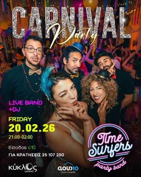 Experience TIME SURFERS Carnival Experience with live music and dancing at Music Stage KYKLOS on 20 February 2026. Ticket price €10. Scroll down for English version 👇 Το καρναβάλι ξεκινά δυνατά στη Μουσική Σκηνή ΚΥΚΛΟΣ με το TIME SURFERS: Carnival Experience, ένα εκρηκτικό live party γεμάτο μουσική, χορό και αποκριάτικη ενέργεια. Από νωρίς το βράδυ μέχρι τις πρώτες πρωινές ώρες, η σκηνή μετατρέπεται σε ένα non-stop carnival mood, ιδανικό για όσους θέλουν να διασκεδάσουν χωρίς όρια. 🎟️ Εισιτήρια από €10. Η βραδιά συνδυάζει ζωντανή μουσική και χορευτικούς ρυθμούς, δημιουργώντας μια ατμόσφαιρα γιορτής που σε παρασύρει στον ρυθμό της Αποκριάς. Ένα party εμπειρίας για όσους αγαπούν τα live events και τη δυναμική νυχτερινή διασκέδαση. 🗓️ Πρόγραμμα Πέμπτη, 20 Φεβρουαρίου 2026 | 21:00–02:00 (Μουσική Σκηνή ΚΥΚΛΟΣ) Phone (Κρατήσεις): 25 107 230 EN The Carnival season kicks off at Music Stage KYKLOS with TIME SURFERS: Carnival Experience, a high-energy live party filled with music, dancing, and Carnival magic. Running late into the night, the event sets the tone for a festive atmosphere that pulls everyone straight into Carnival mood. 🎟️ Ticket prices start from €10. Expect an explosive live party experience where music and movement take centre stage, creating a vibrant celebration for Carnival lovers and night-life fans looking for something bold and energetic. 🗓️ Schedule Thursday, February 20, 2026 | 21:00–02:00 (Music Stage KYKLOS) Phone (Reservations): 25 107 230 Explore more Carnival Events → eventor.com.cy/events/category/carnival-127 ❓ FAQ Q: What time does the event start and end? A: The event runs from 21:00 until 02:00. Q: How much is the entry ticket? A: Entry is €10 per person. Q: Where does the event take place? A: At Music Stage KYKLOS. Q: How can I make a reservation? A: Reservations can be made by phone at 25 107 230.