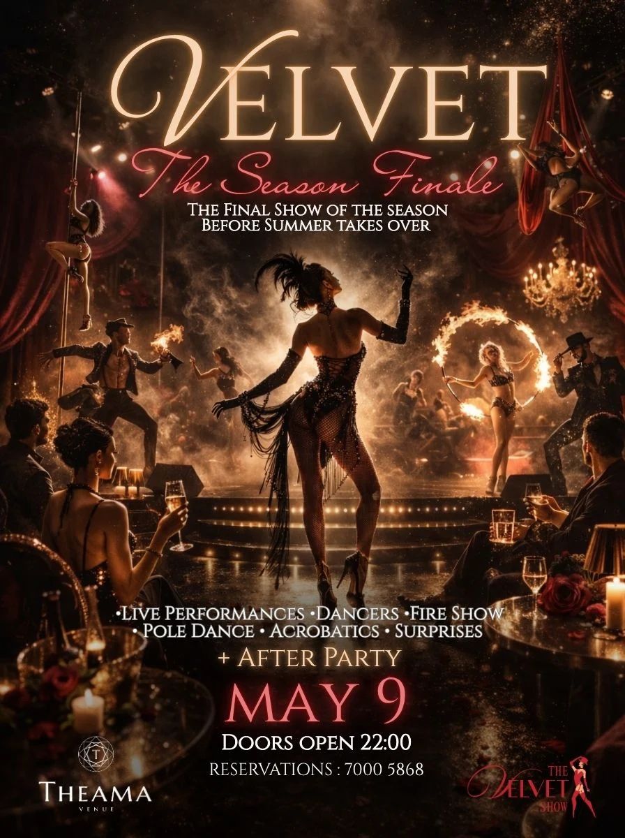 Velvet returns to Theama Venue in Limassol on May 9, 2026 for its most striking season finale yet — live acts, bold choreography, fire, acrobatics and a DJ after party. Ages 18+. --- Scroll down for English version 👇 --- Το Velvet επιστρέφει για τελευταία φορά αυτή τη σεζόν στο Theama Venue στη Λεμεσό, το Σάββατο 9 Μαΐου 2026. Η παράσταση ξεκινά στις 22:30 (οι πόρτες ανοίγουν στις 22:00) και υπόσχεται την πιο δυνατή, πιο εκλεπτυσμένη και οπτικά εντυπωσιακή έκδοσή της. Απευθύνεται αποκλειστικά σε άτομα 18 ετών και άνω. 🎟️ Εισιτήρια από €25 ανά άτομο. Πρόκειται για ένα modern cabaret show που συνδυάζει ζωντανές παραστάσεις, τολμηρές χορογραφίες, fire acts, pole dance, ακροβατικά και εντυπωσιακά κοστούμια σε μια ενιαία, καθηλωτική εμπειρία. Κάθε λεπτομέρεια έχει σημασία, κάθε στιγμή οδηγεί στην επόμενη. Η διάρκεια είναι 2 ώρες με διάλειμμα 25 λεπτών, ενώ το βράδυ συνεχίζεται με DJ After Party. Επιλογές εισιτηρίων: Bar Ticket (Κεντρική & Δεξιά Ζώνη): €35 ανά άτομο, συμπεριλαμβάνεται ένα ποτό (standing only) Blue Island Tables (3–5 άτομα): €25 ανά άτομο + ελάχιστη κατανάλωση €200 ανά τραπέζι Pink Island Tables (3–5 άτομα): €25 ανά άτομο + ελάχιστη κατανάλωση €250 ανά τραπέζι Sofas (4–6 άτομα): €25 ανά άτομο + ελάχιστη κατανάλωση €350 ανά σόφα VIP Sofas (4–6 άτομα): €25 ανά άτομο + ελάχιστη κατανάλωση €500 ανά σόφα 🗓️ Πρόγραμμα Σάββατο, 9 Μαΐου 2026 | 22:30 (Theama Venue, Λεμεσός) – Πόρτες: 22:00 Για περισσότερες πληροφορίες και κρατήσεις, επικοινωνήστε απευθείας με τους διοργανωτές. --- EN This modern cabaret experience in Limassol, Cyprus closes out its season at Theama Venue on Saturday, May 9, 2026 — and it promises to be the most refined and visually commanding edition yet. Doors open at 22:00, with the show starting at 22:30. Strictly for guests aged 18 and above. 🎟️ Ticket prices start from €25 per person. Velvet is a world you step into rather than a show you simply watch. Live performances, bold choreographies, captivating dancers, fire acts, pole dance, acrobatics, and statement costumes all converge into one seamless, immersive experience. Running for 2 hours with a 25-minute interval, the night then continues with a DJ After Party. Ticketing options: Bar Ticket – Central & Right Zone: €35 per person, includes one drink (standing only) Blue Island Tables (3–5 persons): €25 per person + €200 minimum spend per table Pink Island Tables (3–5 persons): €25 per person + €250 minimum spend per table Sofas (4–6 persons): €25 per person + €350 minimum spend per sofa VIP Sofas (4–6 persons): €25 per person + €500 minimum spend per sofa 🗓️ Schedule Saturday, May 9, 2026 | 22:30 (Theama Venue, Limassol) – Doors: 22:00 For more information and booking details, contact the event organiser directly. Explore more Live Shows & Comedy → eventor.com.cy/events/category/live-shows---comedy-148 --- ❓ FAQ Q: What kind of show is Velvet? A: Velvet is a modern cabaret show featuring live performances, bold choreography, fire acts, pole dance, acrobatics, and statement costumes, followed by a DJ after party. Q: What time does the event start and how long does it run? A: Doors open at 22:00 and the show begins at 22:30. Total running time is 2 hours with a 25-minute interval. Q: What are the ticketing options? A: Bar tickets (standing) are €35 per person including one drink. Table, sofa, and VIP sofa options start from €25 per person with a minimum spend requirement per seating area. Q: Is there an age restriction? A: Yes, the event is strictly for guests aged 18 and above.