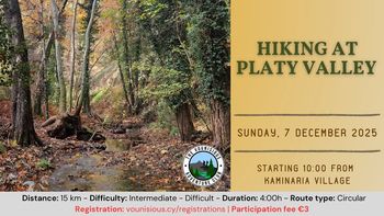 👉 Scroll down for English version Η ομάδα Vounisious σε προσκαλεί σε μια φθινοπωρινή πεζοπορική εμπειρία στην Κοιλάδα του Πλατύ, την Κυριακή, 7 Δεκεμβρίου 2025, στις 10:00 π.μ., με σημείο εκκίνησης το χωριό Καμινάρια. 🍂 Περπάτησε μέσα σε ένα μαγευτικό τοπίο με φθινοπωρινά χρώματα, ποταμό Διάριζο, και εκδρομικό διάλειμμα στον χώρο Κομιτιτζί. Ίσως, με λίγη τύχη, να δεις και Αγρινά στη διαδρομή! 🐏 🥾 Τι να περιμένετε: • Ειδικά σχεδιασμένη Vounisious διαδρομή • Φθινοπωρινό τοπίο στην καρδιά της φύσης • Πεζοπορία δίπλα στον ποταμό Διάριζο • Στάση στον εκδρομικό χώρο Κομιτιτζί • Υπέροχα σημεία θέας • Πιθανή παρατήρηση Αγρινών 📍 Σημείο Συνάντησης: Χωριό Καμινάρια Παρακαλούμε να είστε εκεί στις 09:45 π.μ. Χάρτης: https://tinyurl.com/m48was4r 🎟️ Κόστος συμμετοχής: €3 ανά άτομο (με προπληρωμή) 🔗 Δήλωση συμμετοχής: https://tinyurl.com/ms4hmbu5 🗓️ Πρόγραμμα: Κυριακή, 7 Δεκεμβρίου 2025 | 10:00 – 14:00 📞 Επικοινωνία: +357 96490480 (Σταύρος – Viber & WhatsApp) ✉️ Email: vounisious@gmail.com 🌐 Ιστοσελίδα: vounisious.cy 🗺️ Στοιχεία Διαδρομής: • 95% χώμα – 5% άσφαλτος • Απόσταση: περίπου 15 χλμ • Διάρκεια: περίπου 4 ώρες • Βαθμός δυσκολίας: Μέτριο – Δύσκολο • Τύπος διαδρομής: Κυκλική 🎒 Προτεινόμενος Εξοπλισμός: • Καπέλο • Μακρύ παντελόνι • Μποτάκια πεζοπορίας • Ρουχισμός ανάλογα με τις καιρικές συνθήκες • Μπαστούνια πεζοπορίας • Ενεργειακές μπάρες ή ηλεκτρολύτες • Σνακ για το διάλειμμα • Τουλάχιστον 1,5 λίτρο νερό 🚨 Σημαντικές Πληροφορίες: • Η πεζοπορία καθοδηγείται από πιστοποιημένο συνοδό πεζοπορίας • Υποχρεωτική η δήλωση συμμετοχής • Ισχύουν Όροι & Προϋποθέσεις EN Join the Vounisious Team for a scenic autumn hike through Platy Valley, on Sunday, December 7, 2025, starting at 10:00 AM from the village of Kaminaria. Enjoy a journey through rich forest trails, colorful landscapes, and peaceful riverside paths along the Diarizos River, with a relaxing break at the Komititzi picnic area. You might even spot a few wild Agrina (mouflon) roaming nearby! 🌿 🥾 What to Expect: • A specially designed Vounisious hiking route • Walking through autumn scenery • Riverside paths by the Diarizos River • Break at Komititzi picnic site • Panoramic viewpoints • Possible Agrina sightings 📍 Meeting Point: Kaminaria village – please arrive by 9:45 AM Map: https://tinyurl.com/m48was4r 🎟️ Participation fee: €3 per person (prepaid) 🔗 Register here: https://tinyurl.com/ms4hmbu5 🗓️ Schedule: Sunday, December 7, 2025 | 10:00 – 14:00 📞 Contact: +357 96490480 (Stavros – Viber & WhatsApp) ✉️ Email: vounisious@gmail.com 🌐 Website: vounisious.cy 📄 Terms: vounisious.cy/terms-and-conditions 🗺️ Trail Info: • 95% off-road – 5% asphalt • Distance: approx. 15 km • Duration: around 4 hours • Difficulty: Moderate to Difficult • Route type: Circular 🎒 Recommended Gear: • Hat, long pants, hiking boots • Weather-appropriate clothing • Trekking poles • Energy bars or electrolytes • Snacks for the break • Minimum 1.5L of water 🍂 A perfect day for nature lovers — explore Platy Valley with Vounisious, discover Diarizos’ hidden beauty, and breathe the crisp mountain air. Explore more Outdoor → https://eventor.com.cy/events/category/outdoor-125 ❓ Micro-FAQ Q: What time does the hike start? A: At 10:00 AM — please arrive by 9:45 AM at Kaminaria village. Q: How difficult is the route? A: Moderate to difficult — about 15 km, mostly off-road. Q: Is there a participation fee? A: Yes, €3 per person (prepaid). Q: Do I need to register? A: Yes, via vounisious.cy/registrations. Q: Who leads the hike? A: A certified hiking guide from the Vounisious team.