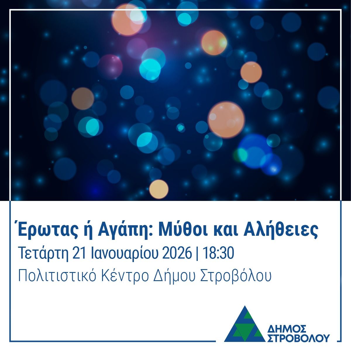 Συμμετέχετε σε ανοικτή συζήτηση στον Στρόβολο τον Ιανουάριο για τον έρωτα και την αγάπη, με δύο συστημικές ψυχοθεραπεύτριες. Ελεύθερη είσοδος. Scroll down for English version 👇 Ο Δήμος Στροβόλου προσκαλεί το κοινό σε μια ανοικτή παρουσίαση – συζήτηση με θέμα τη σχέση ανάμεσα στον έρωτα και την αγάπη, τα όρια, τις διαφορές και τις αλήθειες που συχνά μπερδεύονται. Η εκδήλωση απευθύνεται σε όσους επιθυμούν να στοχαστούν και να συζητήσουν ουσιαστικά για τις ανθρώπινες σχέσεις και τη συναισθηματική σύνδεση. Η συζήτηση θα αναπτυχθεί γύρω από ερωτήματα όπως αν ο έρωτας φεύγει, αν η αγάπη αρκεί από μόνη της και πώς μπορούν να συντηρηθούν και τα δύο μέσα στον χρόνο. Εισηγήτριες είναι οι συστημικές ψυχοθεραπεύτριες Άντρη Χριστούδια και Στέλλα Σαββίδου, με έμφαση στη βιωματική προσέγγιση και τον ανοιχτό διάλογο. 🤍 🎟️ Δωρεάν είσοδος. 🗓️ Πρόγραμμα Τετάρτη, 21 Ιανουαρίου 2026 | 18:30 (Πολιτιστικό Κέντρο Δήμου Στροβόλου – Αίθουσα «Νικόλαος Μούντης») Εγγραφές: tinyurl.com/nh5kvx7v EN This public discussion in Strovolos, Cyprus invites participants to explore the relationship between love and romance, addressing common myths, questions, and emotional realities. Organised by the Municipality of Strovolos, the event offers an open and reflective space focused on connection and meaningful dialogue. Two systemic psychotherapists guide the conversation, examining whether love and romance differ, how they evolve over time, and how relationships can be nurtured with awareness and care. The session is designed for thoughtful participation and shared reflection in a welcoming cultural setting. 🤍 🎟️ Free entry. 🗓️ Schedule Wednesday, January 21, 2026 | 18:30 (Strovolos Cultural Centre – “Nikolaos Mountis” Hall) Registration: tinyurl.com/nh5kvx7v Explore more Workshops & Classes → eventor.com.cy/events/category/workshops---classes-122 ❓ FAQ Q: Who is the event organised by? A: The event is organised by the Municipality of Strovolos. Q: Is there an entrance fee? A: No. Entry is free. Q: Is registration required? A: Yes. Participation requires prior registration through the provided online form. Q: Who are the speakers? A: The discussion is led by systemic psychotherapists Andri Christoudia and Stella Savvidou.