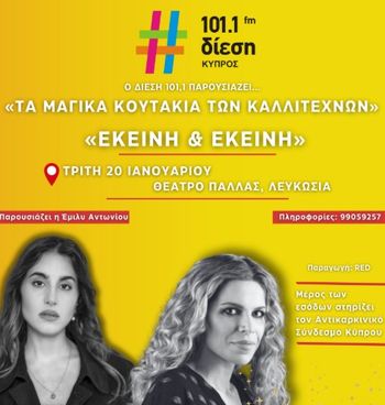 Scroll down for English version 👇 Ο ραδιοφωνικός σταθμός Δίεση 101.1 παρουσιάζει «Τα Μαγικά Κουτάκια των Καλλιτεχνών», μια ξεχωριστή μουσική βραδιά με τίτλο «Εκείνη & Εκείνη», που φιλοξενείται στο Θέατρο Πάλλας στη Λευκωσία. Πρόκειται για μια παράσταση που συνδυάζει τη ζωντανή μουσική με τη ραδιοφωνική αφήγηση, δημιουργώντας μια ιδιαίτερη εμπειρία ακρόασης. Η Βιολέτα Ίκαρη και η Παυλίνα Βουλγαράκη συναντιούνται επί σκηνής σε μια βραδιά γεμάτη συναίσθημα, φωνές που μπλέκονται και ιστορίες που αξίζουν να ειπωθούν. Μέρος των εσόδων της εκδήλωσης στηρίζει τον Αντικαρκινικό Σύνδεσμο Κύπρου, προσδίδοντας στη βραδιά και έναν κοινωνικό χαρακτήρα. 🎶 🗓️ Πρόγραμμα Τρίτη, 20 Ιανουαρίου 2026 | 20:00 (Θέατρο Πάλλας, Nicosia) Phone: 99059257 EN This live music event in Nicosia, Cyprus is presented by radio station Diesi 101.1 as part of the series “Ta Magika Koutakia ton Kallitechnon”. Titled “Ekeini & Ekeini”, the evening blends live performance with the intimacy of a radio-style music experience at Pallas Theatre. Greek singers Violeta Ikari and Pavlina Voulgaraki share the stage in a performance filled with emotion, storytelling, and musical dialogue. Part of the event’s proceeds supports the Cyprus Anti-Cancer Association, adding a meaningful social dimension to the night. 🎵 🗓️ Schedule Tuesday, January 20, 2026 | 20:00 (Pallas Theatre, Nicosia) Phone: 99059257 Explore more Concerts & Live Music → eventor.com.cy/events/category/concerts---live-music-114 ❓ FAQ Q: Who presents the event? A: The event is presented by radio station Diesi 101.1. Q: Who are the performers? A: Violeta Ikari and Pavlina Voulgaraki. Q: Where does the event take place? A: At Pallas Theatre in Nicosia. Q: Does the event support a cause? A: Yes. Part of the proceeds support the Cyprus Anti-Cancer Association.