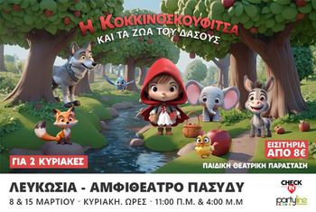 Απολαύστε την «Κοκκινοσκουφίτσα και τα Ζώα του Δάσους» στο Αμφιθέατρο ΠΑΣΥΔΥ στη Λευκωσία, στις 8 και 15 Μαρτίου 2026, με παραστάσεις κάθε Κυριακή για όλη την οικογένεια. Scroll down for English version 👇 Η παιδική παράσταση «Η Κοκκινοσκουφίτσα και τα Ζώα του Δάσους» παρουσιάζεται στο Αμφιθέατρο ΠΑΣΥΔΥ στη Λευκωσία, τις Κυριακές 8 και 15 Μαρτίου 2026. Με τέσσερις συνολικά παραστάσεις, στις 11:00 και στις 16:00 κάθε ημέρα, η αγαπημένη ιστορία ζωντανεύει στη σκηνή για μικρούς και μεγάλους. Η κλασική αφήγηση της Κοκκινοσκουφίτσας συναντά τα ζώα του δάσους σε μια θεατρική εμπειρία που απευθύνεται σε οικογένειες και παιδιά, προσφέροντας ψυχαγωγία σε ένα φιλόξενο θεατρικό περιβάλλον. 🎟️ Εισιτήρια από €8. 🗓️ Πρόγραμμα Κυριακή, 8 Μαρτίου 2026 | 11:00 & 16:00 (Αμφιθέατρο ΠΑΣΥΔΥ, Λευκωσία) Κυριακή, 15 Μαρτίου 2026 | 11:00 & 16:00 (Αμφιθέατρο ΠΑΣΥΔΥ, Λευκωσία) Για περισσότερες πληροφορίες και εγγραφές, επικοινωνήστε απευθείας με τους διοργανωτές. EN This family theatre performance in Nicosia, Cyprus takes place at PASYDY Amphitheatre on Sunday, March 8 and Sunday, March 15, 2026, with shows at 11:00 and 16:00 on both dates. “Little Red Riding Hood and the Animals of the Forest” brings the beloved fairy tale to the stage in a production designed for children and families. Across four performances, audiences can enjoy a classic story brought to life in a welcoming theatrical setting. 🎟️ Ticket prices start from €8. 🗓️ Schedule Sunday, March 8, 2026 | 11:00 & 16:00 (PASYDY Amphitheatre, Nicosia) Sunday, March 15, 2026 | 11:00 & 16:00 (PASYDY Amphitheatre, Nicosia) For more information and registration details, please contact the organiser directly. Explore more Family & Kids → eventor.com.cy/events/category/family---kids-112 ❓ FAQ Q: When are the performances scheduled? A: On March 8 and March 15, 2026 at 11:00 and 16:00. Q: Where is the show taking place? A: At PASYDY Amphitheatre in Nicosia. Q: How much do tickets cost? A: Tickets range from €8 to €13 depending on the seating zone. Q: Is this event suitable for children? A: Yes, it is a family theatre performance designed for children and families.