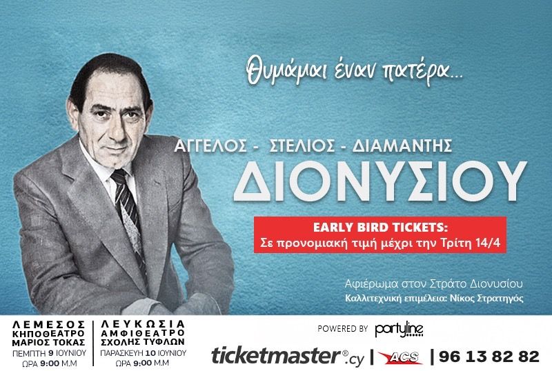 Οι γιοι του Στράτου Διονυσίου τιμούν τον πατέρα τους σε δύο συναυλίες-αφιέρωμα στην Κύπρο, 11 και 12 Ιουνίου 2026 — Λευκωσία και Λεμεσός. Εισιτήρια διαθέσιμα. --- Scroll down for English version 👇 --- Ένα μεγάλο μουσικό αφιέρωμα στον αξέχαστο Στράτο Διονυσίου έρχεται για δεύτερη φορά στην Κύπρο — μετά τις sold out εμφανίσεις του 2023. Οι τρεις γιοι του, Άγγελος, Στέλιος και Διαμαντής Διονυσίου, που ακολούθησαν τα μουσικά βήματα του πατέρα τους, θα τον τιμήσουν επί σκηνής με δύο μεγάλες συναυλίες: την Πέμπτη 11 Ιουνίου 2026 στο Αμφιθέατρο Σχολής Τυφλών στη Λευκωσία και την Παρασκευή 12 Ιουνίου 2026 στο Κηποθέατρο «Μάριος Τόκας» στη Λεμεσό. Έναρξη 21:00. Καλλιτεχνική επιμέλεια: μαέστρος Νίκος Στρατηγός. Ο Στράτος Διονυσίου υπήρξε ένας από τους σπουδαιότερους λαϊκούς τραγουδιστές της Ελλάδας, με τραγούδια που παραμένουν διαχρονικά 33 χρόνια μετά τον θάνατό του: «Ο Ξένος», «Βρέχει φωτιά στη στράτα μου», «Τα πήρες όλα» και πολλά άλλα. Η βραδιά είναι μια προσωπική και καλλιτεχνική πράξη μνήμης από τους ίδιους τους γιους του. 🎟️ Εισιτήρια από €15 (early bird). 🗓️ Πρόγραμμα Πέμπτη, 11 Ιουνίου 2026 | 21:00 (Αμφιθέατρο Σχολής Τυφλών, Λευκωσία) Ζώνη Α: €25 | Ζώνη Β: €20 | Ζώνη Γ: €15 Παρασκευή, 12 Ιουνίου 2026 | 21:00 (Κηποθέατρο «Μάριος Τόκας», Λεμεσός) Ζώνη Α: €25 | Ζώνη Β: €20 | Ζώνη Γ: €15 | Ζώνη Δ: €10 ❓ Συχνές Ερωτήσεις Ε: Διαφέρουν οι τιμές εισιτηρίων μεταξύ των δύο παραστάσεων; Α: Ναι. Το Κηποθέατρο Λεμεσού προσφέρει επιπλέον Ζώνη Δ στα €10. Και στους δύο χώρους ισχύουν early bird τιμές. Ε: Οι παραστάσεις είναι σε εσωτερικό ή εξωτερικό χώρο; Α: Και οι δύο παραστάσεις πραγματοποιούνται σε υπαίθριους χώρους — αμφιθέατρο και κηποθέατρο. Ε: Πρόκειται για την πρώτη φορά που γίνεται αυτό το αφιέρωμα στην Κύπρο; Α: Όχι. Η παράσταση είχε πραγματοποιηθεί με sold out εμφανίσεις στην Κύπρο το 2023. Αυτή είναι η δεύτερη επίσκεψη. --- EN This special tribute concert to the legendary Greek laïká singer Stratos Dionisiou returns to Cyprus for the second time — following sold-out shows in 2023 — under the title Θυμάμαι Έναν Πατέρα (I Remember a Father). His three sons, Angelos, Stelios, and Diamantis Dionisiou, who have followed in their father's musical footsteps, honour him on stage across two evenings: Thursday 11 June 2026 at the Amphitheatre of the School for the Blind in Nicosia, and Friday 12 June 2026 at the Marios Tokas Garden Theatre in Limassol. Both shows begin at 21:00. Artistic direction: Maestro Nikos Stratigis. Stratos Dionisiou was one of the greatest voices in Greek folk music, leaving an indelible mark with songs like O Xenos, Vrehei Fotia Sti Strata Mou, and Ta Pires Ola — timeless classics that remain beloved 33 years after his passing. This concert is both a personal and artistic act of remembrance by his own family. 🎟️ Ticket prices start from €15 (early bird). 🗓️ Schedule Thursday, 11 June 2026 | 21:00 (Amphitheatre of the School for the Blind, Nicosia) Zone A: €25 | Zone B: €20 | Zone C: €15 Friday, 12 June 2026 | 21:00 (Marios Tokas Garden Theatre, Limassol) Zone A: €25 | Zone B: €20 | Zone C: €15 | Zone D: €10 ❓ FAQ Q: Do ticket prices differ between the two venues? A: Yes. The Limassol venue offers an additional Zone D at €10. Early bird pricing applies at both venues. Q: Are the concerts indoors or outdoors? A: Both concerts take place in open-air venues — an amphitheatre in Nicosia and a garden theatre in Limassol. Q: Is this the first time this tribute has come to Cyprus? A: No. The show visited Cyprus in 2023 to sold-out audiences. This is its second Cyprus appearance. Explore more Concerts & Live Music → eventor.com.cy/events/category/concerts---live-music-114