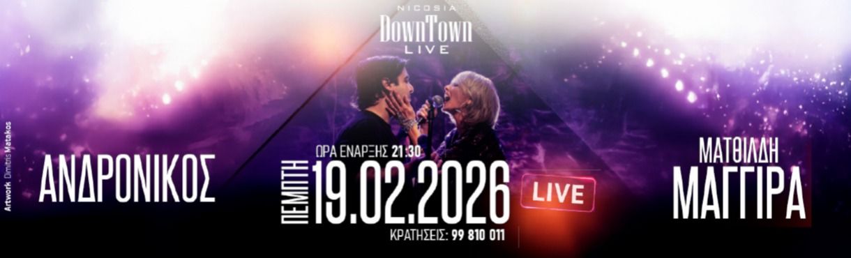 Απολαύστε μια ζωντανή μουσική βραδιά στη Λευκωσία τον Φεβρουάριο 2026 με τη Ματθίλδη Μαγγίρα και τον Ανδρόνικο στο DownTown Live. Scroll down for English version 👇 Η Ματθίλδη Μαγγίρα και ο Ανδρόνικος εμφανίζονται ζωντανά στη Λευκωσία για μια ξεχωριστή μουσική βραδιά στο DownTown Live. Το πρόγραμμα υπόσχεται ένταση, συναίσθημα και αγαπημένα τραγούδια σε έναν από τους πιο γνωστούς live χώρους της πόλης. Οι πόρτες ανοίγουν στις 20:30 και η συναυλία ξεκινά στις 21:30. Υπάρχει δυνατότητα εισιτηρίου για bar ή για τραπέζι, με συγκεκριμένους όρους κράτησης, ενώ η είσοδος επιτρέπεται μόνο σε άτομα άνω των 18 ετών. 🎟️ Εισιτήρια από €15. 🗓️ Πρόγραμμα Πέμπτη, 19 Φεβρουαρίου 2026 | Πόρτες: 20:30 · Έναρξη: 21:30 (DownTown Live, Λευκωσία) Πληροφορίες εισιτηρίων & κρατήσεων Προπώληση bar: €15 Προπώληση τραπέζι: €15 Για κρατήσεις τραπεζιών απαιτούνται 4–6 εισιτήρια ανά τραπέζι Ελάχιστη κατανάλωση για τραπέζια: €15/άτομο Η είσοδος επιτρέπεται μόνο σε άτομα 18+ Phone (τραπέζια): 99810011 Email (online tickets): support@more.com EN Matilde Maggira and Andronikos perform live in Nicosia, Cyprus for a special concert night at DownTown Live. The show brings together two well-known voices of the Greek music scene in an intimate live setting. Doors open at 20:30, with the concert starting at 21:30. Tickets are available for bar or table seating, with specific table reservation conditions. Entry is strictly limited to guests aged 18 and over. 🎟️ Ticket prices start from €15. 🗓️ Schedule Thursday, February 19, 2026 | Doors: 20:30 · Show: 21:30 (DownTown Live, Nicosia) Tickets & reservations Bar presale: €15 Table presale: €15 Table reservations require 4–6 tickets per table Minimum consumption for tables: €15 per person 18+ only Phone (tables): 99810011 Email (online tickets): support@more.com Explore more Concerts & Live Music → eventor.com.cy/events/category/concerts---live-music-114 ❓ FAQ Q: What time does the concert start? A: Doors open at 20:30 and the concert starts at 21:30. Q: Are there table reservations? A: Yes, table reservations are available with a minimum of 4–6 tickets per table. Q: Is there an age restriction? A: Yes, entry is restricted to guests aged 18 and over. Q: How much is the minimum consumption for tables? A: €15 per person.
