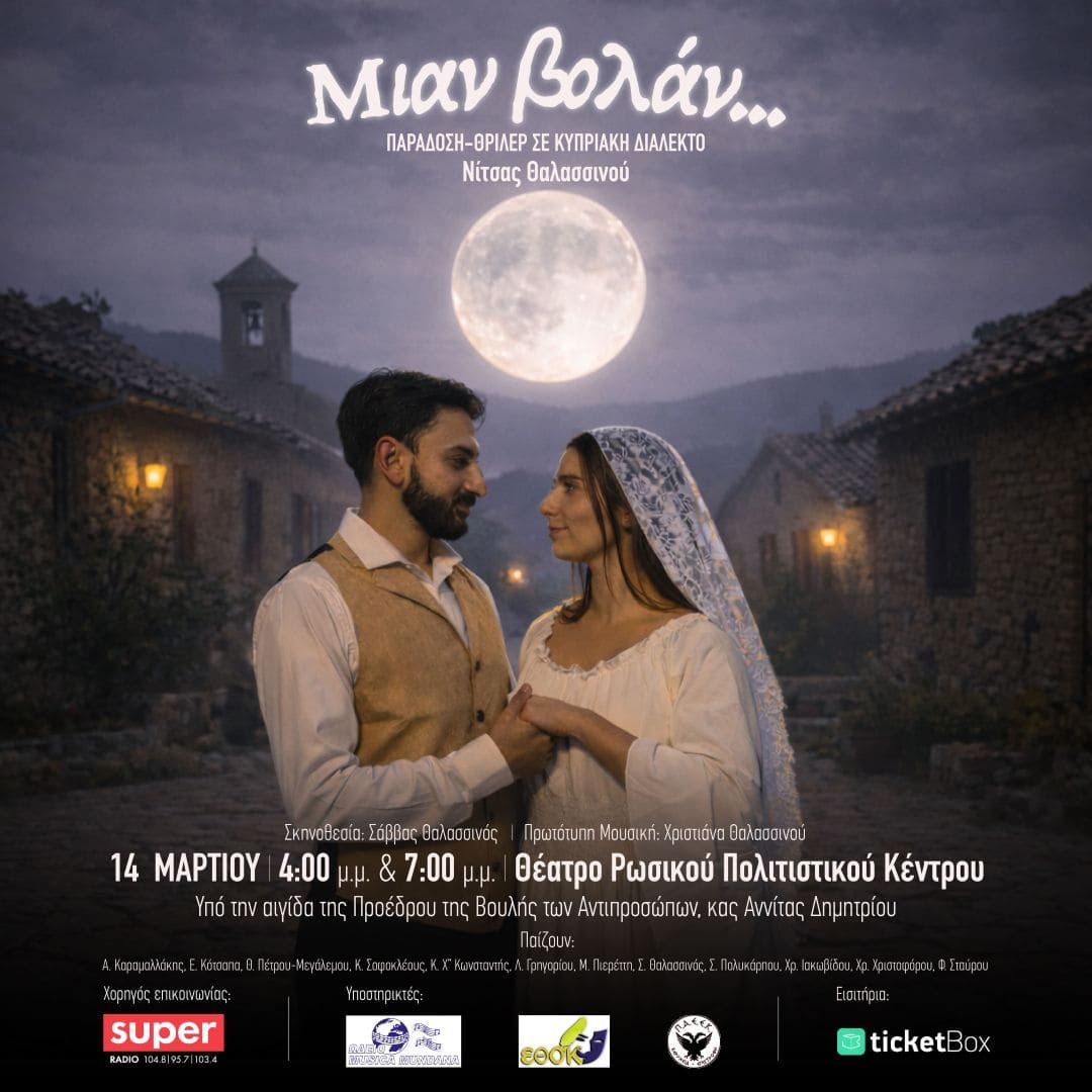 Ανακαλύψτε ένα θεατρικό θρίλερ λαϊκής παράδοσης στη Λευκωσία τον Μάρτιο 2026, με κυπριακή διάλεκτο και πρωτότυπη μουσική. Εισιτήρια διαθέσιμα. Scroll down for English version 👇 Ένα θεατρικό θρίλερ βασισμένο στη λαϊκή παράδοση της Κύπρου ζωντανεύει στη σκηνή του Θεάτρου Ρωσικού Πολιτιστικού Κέντρου στη Λευκωσία. Το έργο «Μιαν Βολάν…» παρουσιάζεται στην κυπριακή διάλεκτο και συνοδεύεται από πρωτότυπη μουσική επένδυση μεσαιωνικού ύφους, δημιουργώντας μια ατμόσφαιρα έντασης και αγωνίας. Η πλοκή αντλεί έμπνευση από παράδοση του χωριού Κλεπίνη της Κερύνειας και ακολουθεί τον Δημητρό και τη Μαρούλα σε μια ιστορία έρωτα που συγκρούεται με τον θάνατο και το υπερφυσικό. Η αγωνία κορυφώνεται μέσα από τη σύγκρουση δύο κόσμων, οδηγώντας σε μια αμφίρροπη εξέλιξη μέχρι την τελική λύση, όπως προστάζει η ίδια η παράδοση. Η παράσταση τελεί υπό την αιγίδα της Προέδρου της Βουλής των Αντιπροσώπων, κας. Αννίτα Δημητρίου, και με τη στήριξη της Ένωσης Θεατρικών Συγγραφέων Κύπρου (ΕΘΣΚ). 🎟️ Εισιτήρια από €13. 🗓️ Πρόγραμμα Σάββατο, 14 Μαρτίου 2026 | 16:00 και 19:00 (Θέατρο Ρωσικού Πολιτιστικού Κέντρου) EN This theatre performance in Nicosia, Cyprus presents a folk thriller inspired by Cypriot tradition, performed in the Cypriot dialect with original medieval-style music. Staged at the Theatre of the Russian Cultural Centre, the production blends folklore, suspense, and emotional storytelling into a unique live experience. Set in the village of Klepini in Kyrenia, the story follows Dimitros and Maroula as love, death, and the supernatural collide. The tension builds through a struggle between two worlds, leading to an outcome decided only at the very last moment, echoing the power of oral tradition and collective memory. The performance is held under the auspices of the President of the House of Representatives, Annita Demetriou, with the support of the Cyprus Theatre Writers’ Union. 🎟️ Ticket prices start from €13. 🗓️ Schedule Saturday, March 14, 2026 | 16:00 & 19:00 (Russian Cultural Centre Theatre) Explore more Theatre & Cinema → eventor.com.cy/events/category/theatre---cinema-123 ❓ FAQ Q: What language is the performance in? A: The play is performed in the Cypriot dialect. Q: How many performances are scheduled? A: There are two performances on the same day, one in the afternoon and one in the evening. Q: Where does the event take place? A: At the Theatre of the Russian Cultural Centre in Nicosia. Q: Is the event suitable for theatre lovers of folklore? A: Yes, it is especially suited for audiences interested in Cypriot tradition and dramatic storytelling.