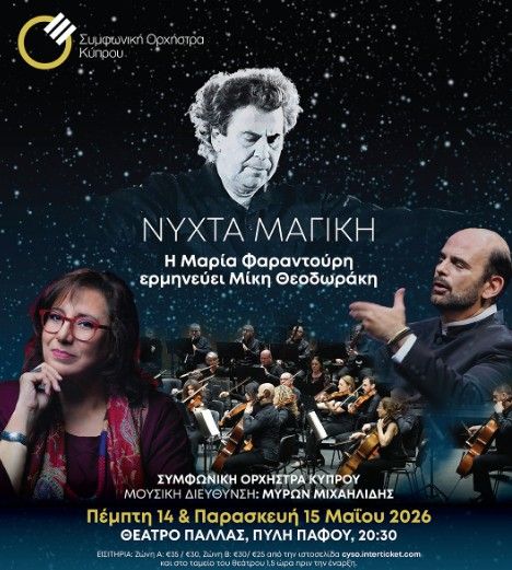 Η Μαρία Φαραντούρη ερμηνεύει Μίκη Θεοδωράκη με τη Συμφωνική Ορχήστρα Κύπρου στο Θέατρο Παλλάς στη Λευκωσία, 14 και 15 Μαΐου 2026. Εισιτήρια διαθέσιμα. --- Scroll down for English version 👇 --- Μια ξεχωριστή μουσική βραδιά αναμένει το κυπριακό κοινό στο Θέατρο Παλλάς στη Λευκωσία, τις Πέμπτη 14 και Παρασκευή 15 Μαΐου 2026 στις 20:30. Η εμβληματική ερμηνεύτρια Μαρία Φαραντούρη συμπράττει με τη Συμφωνική Ορχήστρα Κύπρου, υπό τη διεύθυνση του νέου Καλλιτεχνικού Διευθυντή της, αρχιμουσικού διεθνούς αναγνώρισης Μύρωνα Μιχαηλίδη. Η βραδιά αποτελεί αφιέρωμα στο πολυδιάστατο έργο του Μίκη Θεοδωράκη. Η Φαραντούρη θα ερμηνεύσει γνωστά τραγούδια που άφησαν εποχή, περιλαμβανομένων τραγουδιών από τον κύκλο «Οδύσσεια» (2007) σε ποίηση Κώστα Καρτελιά, σε εκλεκτές ενορχηστρώσεις των Αντώνη Σουσάμογλου και Λάζαρου Τσαβδαρίδη. Η βραδιά συμπληρώνεται από τη συμφωνική σουίτα-μπαλέτου «Το Καρναβάλι» (1953), ένα έργο που αντλεί από λαϊκές μελωδίες και χορούς τους οποίους ο Θεοδωράκης ενορχηστρώνει ευρηματικά. Οι συναυλίες πραγματοποιούνται υπό την αιγίδα της Κυπριακής Προεδρίας του Συμβουλίου της Ευρωπαϊκής Ένωσης 2026. 🗓️ Πρόγραμμα Πέμπτη, 14 Μαΐου 2026 | 20:30 (Θέατρο Παλλάς, Λευκωσία) Παρασκευή, 15 Μαΐου 2026 | 20:30 (Θέατρο Παλλάς, Λευκωσία) Ιστοσελίδα: cyso.org.cy ❓ Συχνές Ερωτήσεις Ε: Πού μπορώ να αγοράσω εισιτήρια; Α: Τα εισιτήρια διατίθενται online μέσω του cyso.interticket.com και από το ταμείο του θεάτρου 1,5 ώρα πριν την έναρξη. Ε: Ποιο είναι το πρόγραμμα της βραδιάς; Α: Η βραδιά περιλαμβάνει τραγούδια του Θεοδωράκη σε ερμηνεία Μαρίας Φαραντούρη — συμπεριλαμβανομένων τραγουδιών από τον κύκλο «Οδύσσεια» — καθώς και τη συμφωνική σουίτα-μπαλέτου «Το Καρναβάλι» (1953). Ε: Υπάρχει χώρος στάθμευσης κοντά στο Θέατρο Παλλάς; Α: Δεν αναφέρεται στην πηγή. Για πληροφορίες επικοινωνήστε απευθείας με τη Συμφωνική Ορχήστρα Κύπρου. --- EN This special two-night concert tribute to the work of Mikis Theodorakis takes place at Pallas Theatre in Nicosia, Cyprus, on Thursday 14 and Friday 15 May 2026 at 20:30. The iconic interpreter of the great Greek composer, Maria Farantouri, performs alongside the Cyprus Symphony Orchestra under the baton of its new Artistic Director, internationally acclaimed conductor Myron Michailidis. Farantouri will perform landmark songs from Theodorakis' catalogue, including works from the Odyssey cycle (2007, poetry by Kostas Kartelias), presented in specially crafted orchestrations by Antonis Sousamoglou and Lazaros Tsavdaridis. The programme is complemented by Theodorakis' symphonic ballet suite The Carnival (1953), a work rooted in folk melodies and dances rendered with inventive orchestration by the composer. The concerts are held under the auspices of the Cyprus Presidency of the Council of the European Union 2026. 🗓️ Schedule Thursday, 14 May 2026 | 20:30 (Pallas Theatre, Nicosia) Friday, 15 May 2026 | 20:30 (Pallas Theatre, Nicosia) Website: cyso.org.cy ❓ FAQ Q: Where can I buy tickets? A: Tickets are available online via cyso.interticket.com and at the theatre box office 1.5 hours before the performance begins. Q: What is the programme for the evening? A: The concert features songs by Theodorakis performed by Maria Farantouri — including works from the Odyssey cycle — alongside the symphonic ballet suite The Carnival (1953). Q: Is parking available near Pallas Theatre? A: Not mentioned in the source. Contact the Cyprus Symphony Orchestra directly for details. Explore more Concerts & Live Music → eventor.com.cy/events/category/concerts---live-music-114