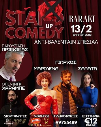 Laugh your way through an anti-Valentine stand-up comedy night in Nicosia this February at BARAKI, featuring multiple comedians and sharp, irreverent humour. Tickets available. Scroll down for English version 👇 Την Πέμπτη 13 Φεβρουαρίου, παραμονή της πιο «υπερκαταναλωτικής» μέρας του χρόνου, το BARAKI στη Λευκωσία φιλοξενεί το αντι-βαλεντίνικο stand-up comedy show «Οι Να Μεν Ζήσουν». Μια βραδιά αφιερωμένη σε όσους είτε βαρέθηκαν τα ρομάντζα είτε απλώς θέλουν να γελάσουν με τον έρωτα χωρίς φίλτρα και καρδούλες. Παρουσιαστής της βραδιάς είναι ο Κώστας Πρίγκιπας, ενώ στη σκηνή ανεβαίνουν η Ειρήνη Σαλάτα, η Μαριλένα Ζωδιάτου και ο Γιώρκος Κυριάκου, ο καθένας με τη δική του οπτική πάνω στις σχέσεις, τον έρωτα και τις αντιφάσεις του. Μαζί τους και ο Χαράμπε, που προτιμά να ξενυχτά παρά να αγοράζει λουλούδια. Το χιούμορ κινείται ανάμεσα στο σαρκαστικό και το αυτοσαρκαστικό, σε μια παράσταση που απευθύνεται σε όσους θέλουν να ξεφύγουν από τα κλισέ της ημέρας. 🎟️ Εισιτήρια από €12. 🗓️ Πρόγραμμα Πέμπτη, 13 Φεβρουαρίου | 21:00 (BARAKI, Λευκωσία) Διοργάνωση: co.media & Nightlife Culture Productions Χορηγοί: AXEL.SHOP, JUMBO SNACKS Τηλέφωνο: 99 755 489 – για πληροφορίες και κρατήσεις Απαραίτητη η αγορά εισιτηρίου για κράτηση EN This stand-up comedy event in Nicosia, Cyprus takes place on Thursday, February 13 at BARAKI and offers an anti-Valentine’s take on love, relationships, and modern dating. Titled “Oi Na Men Zisoun,” the show delivers sharp, irreverent humour for anyone looking to avoid the clichés of Valentine’s Day. Hosted by Kostas Prigkipas, the lineup includes Eirini Salata, Marilena Zodiatou, Giorgos Kyriakou, and Harambe, each bringing their own comedic perspective on romance, expectations, and human contradictions. The result is a fast-paced comedy night designed for laughter, honesty, and a refreshing break from hearts and roses. 🎟️ Ticket prices start from €12. 🗓️ Schedule Thursday, February 13 | 21:00 (BARAKI, Nicosia) Organisers: co.media & Nightlife Culture Productions Sponsors: AXEL.SHOP, JUMBO SNACKS Phone: 99 755 489 – for information and reservations Ticket purchase required for reservations Explore more Live Shows & Comedy → eventor.com.cy/events/category/live-shows---comedy-148 ❓ FAQ Q: What kind of show is “Οι Να Μεν Ζήσουν”; A: It is an anti-Valentine stand-up comedy show with multiple comedians. Q: When does the show take place? A: On Thursday, February 13 at 21:00. Q: Where is the venue? A: The show takes place at BARAKI in Nicosia. Q: Is a ticket required for reservations? A: Yes, purchasing a ticket is mandatory in order to make a reservation.