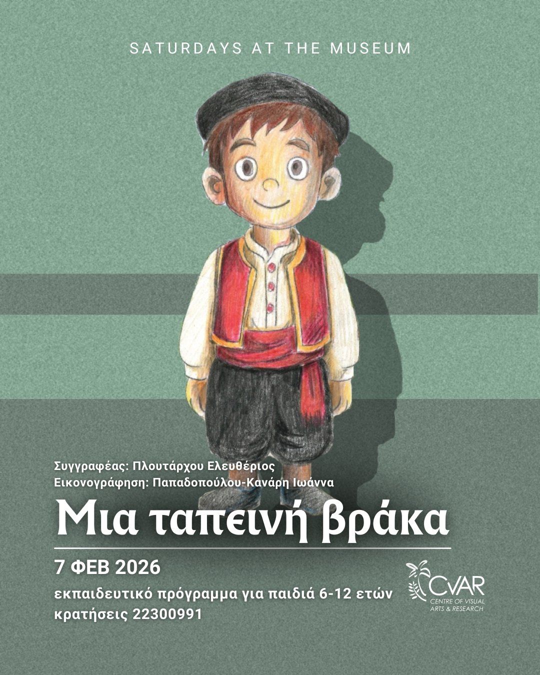 Ανακαλύψτε ένα παιδικό εργαστήρι στο μουσείο στη Λευκωσία τον Φεβρουάριο 2026, με αφήγηση, θεατρικό παιχνίδι και λαϊκή παράδοση. Scroll down for English version 👇 Με αφορμή την παιδική ιστορία «Μια ταπεινή βράκα», το πρόγραμμα «Σάββατο στο Μουσείο» προσκαλεί παιδιά και συνοδούς σε μια βιωματική γνωριμία με την παραδοσιακή ανδρική ενδυμασία της Κύπρου και τη λαϊκή μας κληρονομιά. Μέσα από την αφήγηση, μικροί και μεγάλοι μαθαίνουν για την ιστορία, τα έθιμα και τις αξίες που συνοδεύουν την κυπριακή παράδοση. Το βιωματικό εργαστήρι περιλαμβάνει δημιουργικές δραστηριότητες γύρω από τη λαϊκή τέχνη, αφήγηση της ιστορίας, θεατρικό παιχνίδι, διαλόγους με φύλλα εργασίας και ζωγραφική εμπνευσμένη από το παραμύθι. Το πρόγραμμα είναι ειδικά σχεδιασμένο για παιδιά ηλικίας 5–12 ετών και στοχεύει στην ενεργή συμμετοχή και τη δημιουργική έκφραση. Ο σχεδιασμός και η υλοποίηση του προγράμματος ανήκουν στους Πλουτάρχου Ελευθέριο και Χριστοφή Αίμιλη. 🎟️ Εισιτήρια από €10 ανά παιδί. 🗓️ Πρόγραμμα Σάββατο, 7 Φεβρουαρίου 2026 | 11:00–12:30 Κρατήσεις & Πληροφορίες: 22300991 Τοποθεσία: Οδός Ερμού 285, 1017 Λευκωσία EN This children’s educational workshop in Nicosia, Cyprus takes place as part of the “Saturday at the Museum” series and is based on the story A Humble Vraka. Through storytelling and hands-on activities, children explore traditional Cypriot male clothing and gain insight into the island’s folk culture and heritage. The experiential programme includes creative activities related to Cypriot folk art, theatrical play, worksheets with guided dialogue, and drawing inspired by the story. Designed for children aged 5–12, the workshop encourages learning through play and imagination. The programme is designed and delivered by Ploutarchos Eleftheriou and Christofi Aimili. 🎟️ Participation cost: €10 per child. 🗓️ Schedule Saturday, February 7, 2026 | 11:00–12:30 Phone (Bookings & Info): 22300991 Location: Ermou Street 285, 1017 Nicosia Explore more Family & Kids → eventor.com.cy/events/category/family---kids-112 ❓ FAQ Q: What ages is the workshop suitable for? A: The activity is suitable for children aged 5–12. Q: What activities are included? A: Storytelling, theatrical play, worksheets, and creative art activities. Q: How long does the workshop last? A: Approximately 90 minutes. Q: How can I make a reservation? A: Reservations can be made by phone using the number provided.