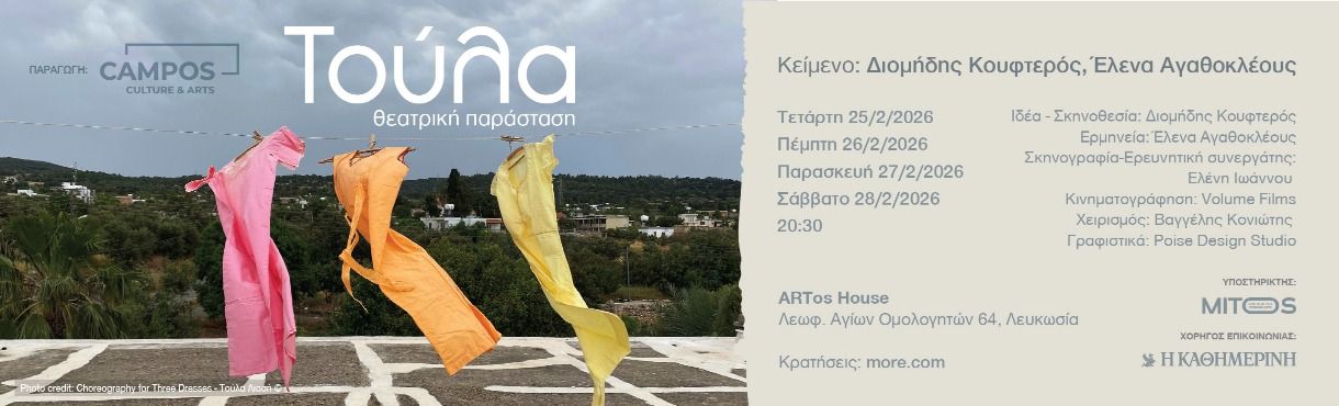 Δείτε την παράσταση «Τούλα» στη Λευκωσία τον Φεβρουάριο 2026 στο ARTos House, ένα θεατρικό πορτραίτο τέχνης, μνήμης και ιστορίας. Scroll down for English version 👇 Η θεατρική παράσταση «Τούλα» παρουσιάζεται στο ARTos House στη Λευκωσία από τις 25 έως τις 28 Φεβρουαρίου 2026, σε παραγωγή της Campos Culture and Arts. Πρόκειται για ένα νέο θεατρικό έργο – ένα ζωντανό πορτραίτο της σημαντικής Κύπριας εικαστικού Τούλα Λιασή – βασισμένο σε αυθεντικές συνεντεύξεις με την ίδια. Το έργο παρακολουθεί την πορεία της Τούλας Λιασή ως ανθρώπου και ως καλλιτέχνιδας, μέσα από τα γεγονότα της νεότερης κυπριακής ιστορίας που σημάδεψαν τη ζωή και τη δημιουργία της. Το κείμενο, γραμμένο αυτούσιο στα κυπριακά από τον σκηνοθέτη Διομήδης Κουφτερός και την ηθοποιό Έλενα Αγαθοκλέους, μεταφέρει με αμεσότητα μνήμη, χιούμορ και βαθιά συγκίνηση. Η παράσταση φωτίζει το έργο μιας καλλιτέχνιδας που πραγματεύεται μέσα από την τέχνη της τα τραύματα της Ιστορίας, το ζήτημα των αγνοουμένων και των εγκλωβισμένων της Καρπασίας, και τη δύναμη της καλλιτεχνικής πράξης ως φορέα μνήμης και πολιτικής συνείδησης. Το αποτέλεσμα είναι μια λιτή αλλά δυνατή σκηνική εμπειρία που ισορροπεί ανάμεσα στην προσωπική αφήγηση και το συλλογικό βίωμα. 🎟️ Εισιτήρια από €12. 🗓️ Πρόγραμμα Τετάρτη 25 Φεβρουαρίου 2026 | 20:30 Πέμπτη 26 Φεβρουαρίου 2026 | 20:30 Παρασκευή 27 Φεβρουαρίου 2026 | 20:30 Σάββατο 28 Φεβρουαρίου 2026 | 20:30 (ARTos House, Λεωφόρος Αγίων Ομολογητών 64, Λευκωσία) Διάρκεια: 60 λεπτά EN This theatre production in Nicosia, Cyprus presents “Toula,” staged at ARTos House from February 25 to 28, 2026. Produced by Campos Culture and Arts, the performance is a theatrical portrait of acclaimed Cypriot visual artist Toula Liasi, based on real interviews and personal testimonies. Written verbatim in Cypriot Greek by director Diomides Koufteros and actress Elena Agathokleous, the play traces Liasi’s life journey alongside key moments of modern Cypriot history. Through memory, restraint, and subtle humour, the production explores art’s ability to confront loss, displacement, and collective trauma, offering a deeply human and resonant theatrical experience. 🎟️ Ticket prices start from €12. 🗓️ Schedule Wednesday, February 25, 2026 | 20:30 Thursday, February 26, 2026 | 20:30 Friday, February 27, 2026 | 20:30 Saturday, February 28, 2026 | 20:30 (ARTos House, Nicosia) Duration: 60 minutes Explore more Theatre & Cinema → eventor.com.cy/events/category/theatre---cinema-123 ❓ FAQ Q: What is the performance “Toula” about? A: It is a theatrical portrait of visual artist Toula Liasi, based on her life and modern Cypriot history. Q: In what language is the performance? A: The performance is written and performed in Cypriot Greek. Q: How long does the show last? A: The duration is approximately 60 minutes. Q: Are reservations required? A: Yes, seating is limited and advance booking is required.