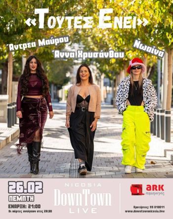 Live μουσική βραδιά στη Λευκωσία με τις Τούτες Ένει στο DownTown Live, με δυναμικές γυναικείες φωνές και ξεχωριστή ενέργεια. Διαθέσιμα εισιτήρια. Scroll down for English version 👇 Οι Τούτες Ένει έρχονται στη μουσική σκηνή του DownTown Live για μια βραδιά γεμάτη ενέργεια, συναίσθημα και ζωντανό ήχο. Η Άννα Χρυσάνθου, η Άντρα Μαύρου και η Νωαίνα ενώνουν τις φωνές και τις μουσικές τους ανησυχίες, πλαισιωμένες από μια παρέα εξαιρετικών μουσικών, δημιουργώντας μια ξεχωριστή εμπειρία για το κοινό. Η βραδιά υπόσχεται μια αλλιώτικη μουσική πρόταση, με έντονη σκηνική παρουσία και αλληλεπίδραση, ιδανική για όσους αναζητούν ζωντανές εμφανίσεις με χαρακτήρα και αυθεντικότητα. Ένα live που μετατρέπει την Πέμπτη σε γιορτή μουσικής στο κέντρο της Λευκωσίας. 🎟️ Είσοδος: €10. 🗓️ Πρόγραμμα Πέμπτη, 26 Φεβρουαρίου | Πόρτες: 20:30 · Έναρξη: 21:00 (DownTown Live, Λευκωσία) Τηλέφωνο κρατήσεων: 99810011 EN This live music night takes place in Nicosia, Cyprus, at DownTown Live, bringing together strong female voices and a vibrant band atmosphere. Tούτες Ένει feature Anna Chrysanthou, Andra Mavrou and Noaina, joined by a group of talented musicians for a performance full of energy and character. The evening promises a distinctive musical approach with dynamic stage presence and an engaging live sound, offering a refreshing midweek escape for lovers of authentic live performances in the heart of the city. 🎟️ Entry: €10. 🗓️ Schedule Thursday, February 26 | Doors: 20:30 · Show starts: 21:00 (DownTown Live, Nicosia) Reservations phone: 99810011 Explore more Concerts & Live Music → eventor.com.cy/events/category/concerts---live-music-114 ❓ FAQ Q: What kind of music can I expect? A: The event features live music with strong vocal performances and a full band. Q: Where does the event take place? A: The concert takes place at DownTown Live in Nicosia. Q: What time do doors open? A: Doors open at 20:30, with the performance starting at 21:00. Q: Is there an entrance fee? A: Yes, entry costs €10.