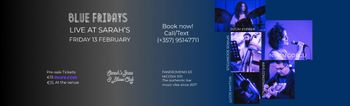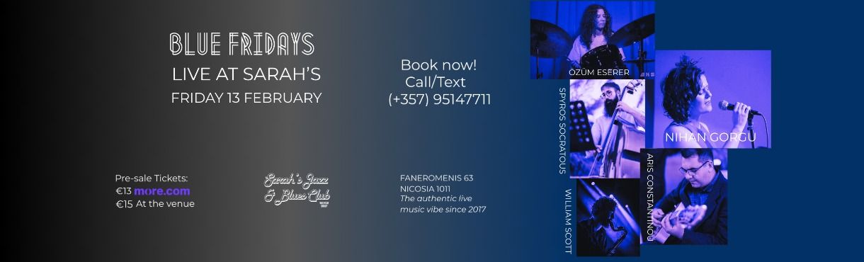Enjoy Blue Fridays Live in Nicosia this February at Sarah’s Jazz & Blues Club, featuring a standout jazz and blues ensemble with tickets available online. Scroll down for English version 👇 Η βραδιά Blue Fridays Live επιστρέφει την Παρασκευή 13 Φεβρουαρίου στο Sarah's Jazz & Blues Club, προσφέροντας μια αυθεντική εμπειρία μπλουζ και τζαζ στο κέντρο της Λευκωσίας. Οι μελωδικοί αυτοσχεδιασμοί και ο ζεστός ρυθμός συναντούν την ατμόσφαιρα ενός ιστορικού jazz club, δημιουργώντας μια βραδιά αφιερωμένη στους λάτρεις της ζωντανής μουσικής. Στη σκηνή ανεβαίνει ένα σύνολο έμπειρων ντόπιων και διεθνών μουσικών: η Nihan Görgü στα φωνητικά, ο Γουίλιαμ Σκοτ στο τενόρο σαξόφωνο, ο Άρης Κωνσταντίνου στην κιθάρα, ο Σπύρος Σωκράτους στο κοντραμπάσο και ο Özüm Eserer στα ντραμς. Μαζί, δίνουν νέα πνοή στις παραδόσεις της μπλουζ και της τζαζ με συναίσθημα, ρυθμό και ελευθερία αυτοσχεδιασμού. 🎟️ Εισιτήρια από €13 (€15 στην είσοδο). 🗓️ Πρόγραμμα Παρασκευή, 13 Φεβρουαρίου 2026 | Πόρτες: 20:00 – Ζωντανή μουσική: 21:30 (Sarah’s Jazz & Blues Club, Λευκωσία) Τηλέφωνο: 95 147 711 – για κρατήσεις και πληροφορίες EN This live music event in Nicosia, Cyprus takes place on Friday, February 13, 2026, at Sarah’s Jazz & Blues Club as part of the Blue Fridays Live series. Blending blues and jazz traditions, the night celebrates improvisation, groove, and the shared joy of live performance in an intimate club setting. The lineup features vocalist Nihan Görgü, tenor saxophonist William Scott, guitarist Aris Konstantinou, double bassist Spyros Sokratous, and drummer Özüm Eserer. Expect expressive solos, tight interplay, and a soulful atmosphere that captures the timeless spirit of jazz and blues. 🎟️ Ticket prices start from €13 (€15 at the door). 🗓️ Schedule Friday, February 13, 2026 | Doors: 20:00 – Live music: 21:30 (Sarah’s Jazz & Blues Club, Nicosia) Phone: 95 147 711 – for reservations and information Explore more Concerts & Live Music → eventor.com.cy/events/category/concerts---live-music-114 ❓ FAQ Q: What kind of music will be played? A: The event features live blues and jazz with a strong emphasis on improvisation. Q: When does the live music start? A: Live music begins at 21:30, with doors opening at 20:00. Q: Are tickets cheaper in advance? A: Yes, presale tickets cost €13, while tickets at the door are €15. Q: Can I reserve a table? A: Yes, reservations are available by phone.
