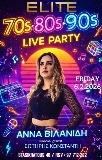 A retro live party in Nicosia celebrating the 70s, 80s and 90s with Anna Vilanidi live and special guest Sotiris Konstantis. Scroll down for English version 👇 Η δεκαετία που δεν ξεχνιέται επιστρέφει στη Λευκωσία με μια live μουσική βραδιά αφιερωμένη στα 70s, 80s και 90s. Το Elite μετατρέπεται σε σκηνή γεμάτη ρυθμό, αναμνήσεις και αγαπημένες επιτυχίες που σημάδεψαν γενιές και συνεχίζουν να ξεσηκώνουν το κοινό. Στο live εμφανίζεται η Άννα Βιλανίδη, ενώ special guest της βραδιάς είναι ο Σωτήρης Κωνσταντής. Μαζί δημιουργούν μια βραδιά γεμάτη ενέργεια, χορό και αυθεντική retro ατμόσφαιρα, ιδανική για όσους αγαπούν τη ζωντανή μουσική και τα διαχρονικά hits. 🎶✨ 🗓️ Πρόγραμμα Παρασκευή, 6 Φεβρουαρίου 2026 (Elite Lounge Bar, Nicosia) Phone (RSVP): 97 712 222 Διεύθυνση: Στασικράτους 40 Για περισσότερες πληροφορίες και κρατήσεις, επικοινωνήστε απευθείας με τους διοργανωτές. EN This live music party in Nicosia, Cyprus brings the spirit of the 70s, 80s and 90s back to the stage for a high-energy retro night. Hosted at Elite Lounge Bar, the event celebrates iconic decades filled with rhythm, nostalgia and dancefloor classics. Anna Vilanidi performs live, joined by special guest Sotiris Konstantis, delivering a show packed with recognisable hits and vibrant stage presence. The night is designed for music lovers who enjoy live performances and timeless songs in a lively nightlife setting. 🎶✨ 🗓️ Schedule Friday, February 6, 2026 (Elite Lounge Bar, Nicosia) Phone (RSVP): 97 712 222 Address: Stasikratous 40 Explore more Nightlife & Parties → eventor.com.cy/events/category/nightlife---parties-128 ❓ FAQ Q: What music will be played during the night? A: Live performances featuring hits from the 1970s, 1980s and 1990s. Q: Who are the performers? A: Anna Vilanidi, with special guest Sotiris Konstantis. Q: Where does the event take place? A: At Elite Lounge Bar in Nicosia. Q: Is reservation required? A: RSVP is recommended via phone.