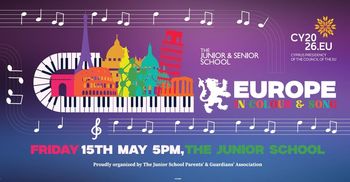 Family Fun Day «Europe in Colour & Song» at The Junior School, Nicosia on Friday May 15, 2026 from 17:00 to 20:30 — art, music, dance and poetry celebrating European values. --- Scroll down for English version 👇 --- Την Παρασκευή 15 Μαΐου 2026, από τις 17:00 έως τις 20:30, το Junior School στη Λευκωσία (Κυριάκου Μάτση, Λευκωσία) φιλοξενεί μια ξεχωριστή οικογενειακή εκδήλωση: «Europe in Colour & Song». Η εκδήλωση διοργανώνεται από τον Σύνδεσμο Γονέων και Κηδεμόνων του Junior School (JSPGA) και εντάσσεται στο πλαίσιο της Κυπριακής Προεδρίας του Συμβουλίου της ΕΕ 2026. Πρόκειται για μια πολιτισμική γιορτή που αναδεικνύει ευρωπαϊκές αξίες όπως η ενότητα, η ειρήνη, η φιλία και η συνεργασία — μέσα από τέχνη, μουσική, χορό και ποίηση. Μια βραδιά για όλη την οικογένεια. 🗓️ Πρόγραμμα Παρασκευή, 15 Μαΐου 2026 | 17:00–20:30 (The Junior School, Κυριάκου Μάτση, Λευκωσία) Για περισσότερες πληροφορίες, επικοινωνήστε απευθείας με τους διοργανωτές. --- EN This family celebration in Nicosia, Cyprus takes place at The Junior School, Kyriacou Matsi, on Friday, May 15, 2026 from 17:00 to 20:30. Organised by the Junior School Parents' and Guardians' Association (JSPGA), the event falls under the auspices of the Cyprus Presidency of the Council of the EU 2026. «Europe in Colour & Song» is a whole-school cultural celebration highlighting European values — unity, peace, friendship, and cooperation — expressed through art, music, dance, and poetry. Families and friends are warmly invited to join for an uplifting and colourful community evening. 🗓️ Schedule Friday, May 15, 2026 | 17:00–20:30 (The Junior School, Kyriacou Matsi, Nicosia) For more information, contact the event organiser directly. Explore more Family & Kids → eventor.com.cy/events/category/family---kids-112 --- ❓ FAQ Q: When and where does the Family Fun Day take place? A: The event takes place on Friday, May 15, 2026 from 17:00 to 20:30 at The Junior School, Kyriacou Matsi, Nicosia. Q: What is the event about? A: «Europe in Colour & Song» is a cultural celebration of European values — unity, peace, friendship, and cooperation — presented through art, music, dance, and poetry by the school community. Q: Who organises the event and what is its wider significance? A: The event is organised by the Junior School PGA and takes place under the auspices of the Cyprus Presidency of the Council of the EU 2026. Q: Is entry free? A: No entry fee is stated in the source. Contact the organiser directly for details.