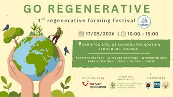 Go Regenerative — Cyprus's first regenerative agriculture festival at the Christos Stelios Ioannou Foundation in Nicosia, May 2026. Free entry. --- Scroll down for English version 👇 --- Το Cyprus Environment Foundation παρουσιάζει το Go Regenerative Festival, το πρώτο φεστιβάλ αναγεννητικής γεωργίας στην Κύπρο, στο Ίδρυμα Χρίστου Στέλιου Ιωάννου στη Λευκωσία. Μια ημέρα αφιερωμένη στη διατροφή, τη γεωργία, τη βιωσιμότητα και την κοινότητα, με δραστηριότητες για οικογένειες, αγρότες, επαγγελματίες, φοιτητές και κάθε ενδιαφερόμενο. 🎟️ Δωρεάν είσοδος. Οι επισκέπτες μπορούν να απολαύσουν γευσιγνωσίες ελαιολάδου, αγορά αναγεννητικών παραγωγών, ζωντανό μαγείρεμα με τοπικά υλικά, ξεναγήσεις σε χώρο επίδειξης αναγεννητικής γεωργίας, ακαδημαϊκές παρουσιάσεις, παιδικές δραστηριότητες με τέχνη, χειροτεχνίες και παιχνίδια, καθώς και φαγητό, ποτά και μουσική καθ' όλη τη διάρκεια. Το φεστιβάλ προσφέρει 3–4 ώρες εμπειριών για όλες τις ηλικίες. Διοργανώνεται υπό την αιγίδα του Γραφείου Επιτρόπου Περιβάλλοντος και Ευζωίας Ζώων, στο πλαίσιο της πρωτοβουλίας Field to Fork Cyprus, με την υποστήριξη του TUI Care Foundation και σε συνεργασία με το KES College και το Ίδρυμα Χρίστου Στέλιου Ιωάννου. 🗓️ Πρόγραμμα Κυριακή, 17 Μαΐου 2026 | 10:00–15:00 (Ίδρυμα Χρίστου Στέλιου Ιωάννου, Λευκωσία) Για περισσότερες πληροφορίες, επικοινωνήστε απευθείας με το Cyprus Environment Foundation. ❓ Συχνές Ερωτήσεις Ε: Το φεστιβάλ είναι κατάλληλο για παιδιά; Α: Ναι, περιλαμβάνει παιδικές δραστηριότητες με τέχνη, χειροτεχνίες και παιχνίδια. Ε: Υπάρχει φαγητό στον χώρο; Α: Ναι, υπάρχουν φαγητό, ποτά, γευσιγνωσίες ελαιολάδου, ζωντανό μαγείρεμα και αγορά τοπικών παραγωγών. Ε: Χρειάζεται εγγραφή; Α: Η είσοδος είναι δωρεάν. Επικοινωνήστε με τους διοργανωτές για τυχόν πληροφορίες εγγραφής. --- EN The Cyprus Environment Foundation presents the Go Regenerative Festival, the first regenerative agriculture festival in Cyprus, at the Christos Stelios Ioannou Foundation in Nicosia, Cyprus. A unique day dedicated to food, farming, sustainability, and community, with something for families, farmers, professionals, students, and anyone curious about sustainable living. 🎟️ Free entry. Visitors can enjoy olive oil tastings, a regenerative farmers market, live cooking with fresh locally sourced ingredients, guided tours of a regenerative farming demonstration site, academic presentations and discussions, children's activities with arts, crafts, and games, plus food, drinks, and music throughout the day. The festival is designed to offer 3–4 hours of engaging experiences for all ages. Held under the auspices of the Commissioner for the Environment and Animal Welfare of the Republic of Cyprus. The festival is part of the Field to Fork Cyprus initiative, supported by the TUI Care Foundation and implemented by the Cyprus Environment Foundation in collaboration with KES College and the Christos Stelios Ioannou Foundation. 🗓️ Schedule Sunday, May 17, 2026 | 10:00–15:00 (Christos Stelios Ioannou Foundation, Nicosia) For more information and registration details, please contact the Cyprus Environment Foundation directly. ❓ FAQ Q: Is the festival suitable for children? A: Yes, it includes children's activities with arts, crafts, and games. Q: Is food available on site? A: Yes, there are olive oil tastings, live cooking, a regenerative farmers market, and food and drinks throughout the day. Q: Is registration required? A: Entry is free. Contact the organisers for any registration details. Explore more Festivals → eventor.com.cy/events/category/festivals-115