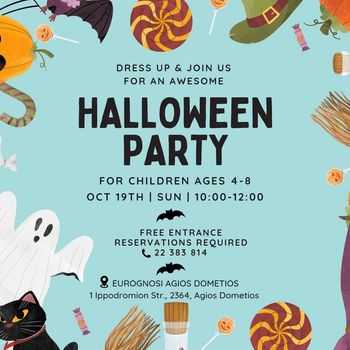 👉 Scroll down for English version Το πρωινό της Κυριακής, 19 Οκτωβρίου 2025, ελάτε με τους μικρούς σας φίλους στο Eurognosi Αγίου Δομετίου για ένα Halloween Party γεμάτο παιχνίδι, δημιουργικότητα και γέλιο! 👻 🎨 Το εργαστήριο περιλαμβάνει τραγούδια, χορό, arts & crafts και δραστηριότητες στα Αγγλικά, ώστε τα παιδιά να μάθουν διασκεδάζοντας. Τα μικρά μας θα περάσουν υπέροχα υπό την καθοδήγηση της ομάδας μας, ενώ γονείς και συνοδοί μπορούν να απολαύσουν τον καφέ τους. ☕ 🎭 Ντυθείτε με τις πιο εντυπωσιακές στολές σας και ελάτε να πάρετε μέρος στον διαγωνισμό καλύτερης μεταμφίεσης με δώρα και εκπλήξεις! 🗓️ Πρόγραμμα: Κυριακή, 19 Οκτωβρίου 2025 | 10:00 – 12:00 📍 Τοποθεσία: Οδός Ιπποδρομίων 1, 2364 Άγιος Δομέτιος, Λευκωσία 📞 Πληροφορίες & κρατήσεις: 22 383 814 ή μήνυμα στη σελίδα Eurognosi Strovolos Lakatamia Agios Dometios 🎟️ Συμμετοχή δωρεάν για παιδιά – απαραίτητη η δήλωση συμμετοχής. EN Join us for a fun-filled Halloween morning on Sunday, October 19, 2025, from 10:00 AM to 12:00 PM at Eurognosi Agios Dometios, Nicosia! 🎃 🎨 Kids will sing, dance, and create Halloween arts & crafts, while also practicing English through play and creativity. It’s a safe, guided, and interactive event where children learn and have fun — and parents can relax with a coffee! ☕ 👻 Don’t forget to dress up for the costume contest — the best costumes will win spooky surprises! 🗓️ Schedule: Sunday, October 19, 2025 | 10:00 – 12:00 📍 Location: 1 Ippodromion Street, 2364 Agios Dometios, Nicosia, Cyprus 📞 Info & registration: +357 22 383 814 or message Eurognosi Strovolos Lakatamia Agios Dometios on Facebook 🎟️ Free participation for kids (registration required). Explore more Family & Kids → https://eventor.com.cy/events/category/family---kids-112 ❓ Micro-FAQ Q: What time is the Halloween party? A: From 10:00 AM to 12:00 PM on Sunday, October 19, 2025. Q: Is it suitable for children? A: Yes — it’s designed for young learners and families. Q: Is there an entry fee? A: No, participation is free, but registration is required. Q: Can kids wear costumes? A: Absolutely — there’s a best costume competition!